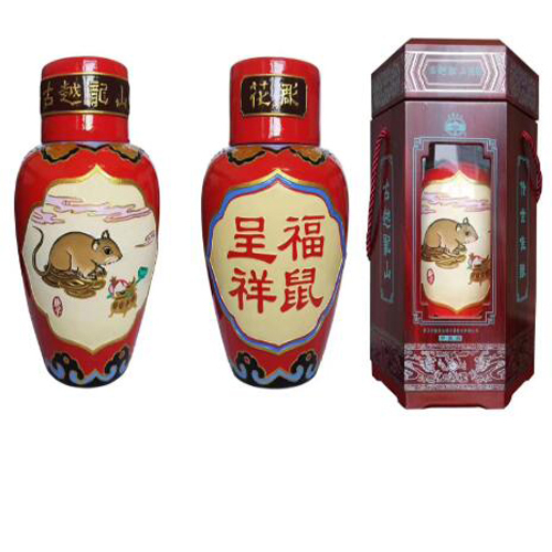 [福鼠呈祥]花雕酒,設計采用中國紅為主色調;體現民族傳統喜慶吉祥國色,所帶給人們一種熱情快樂進取美好感覺。借鑒立體的線描表現手法,刻畫出形像可愛的吉祥鼠,通過與六個數銅錢圖案和聚寶盆組合,銅錢吉數寓意鼠年萬事風順,聚寶盆內石榴桃子玉如意金元寶圖案,寓意石榴象征多子多福,桃子代表長壽,如意表達在日常生活中萬事如意,金元寶帶給人民財富擴進。是人們對美好生活的想望。花雕壇上還增設[福鼠呈祥]的漢字隸書體與庚子印章組合,包溶了中華民族藝術風格的特色印象。在小小花雕壇上截體了吳越地區習俗活動及紹興的黃酒文化重要元素組成部分。