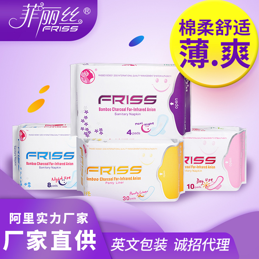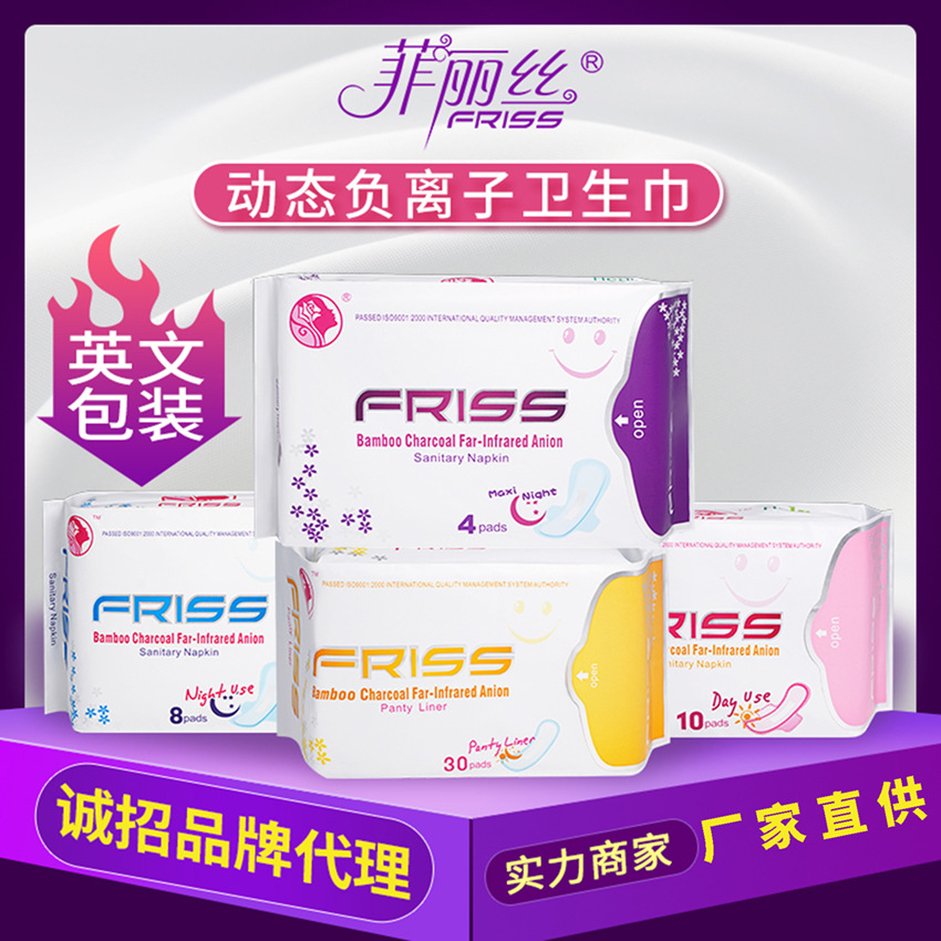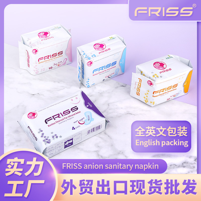 英文包裝衛生巾280mm貼牌定制 負離子日用夜用姨媽巾出口透氣代工廠