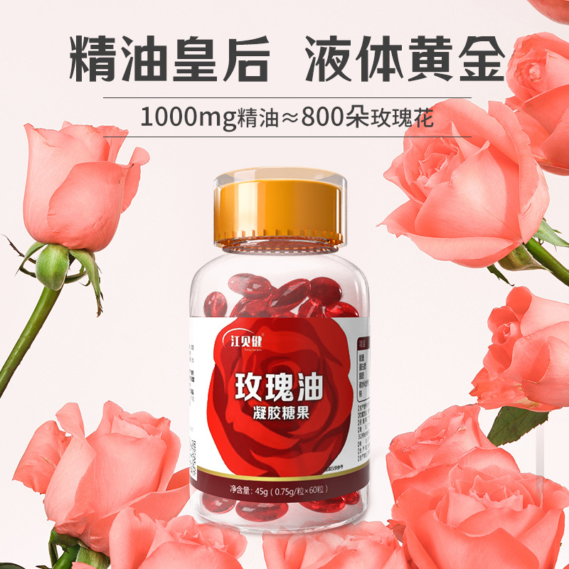 江貝健玫瑰油凝膠糖果貼牌定制食用軟膠囊糖果玫瑰油60粒瓶裝一站式貼牌代加工
