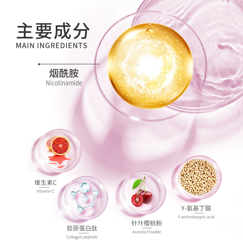 煙酰胺、血橙果粉、針葉櫻桃、紅石榴、魚膠原蛋白肽、y-氨基丁酸、維生素C、維生素A、維生素B1 等