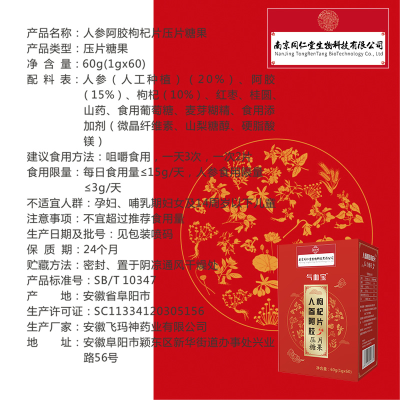氣血寶人參阿膠枸杞片OEM貼牌代加工 壓片糖果南京同仁堂源頭廠家批發