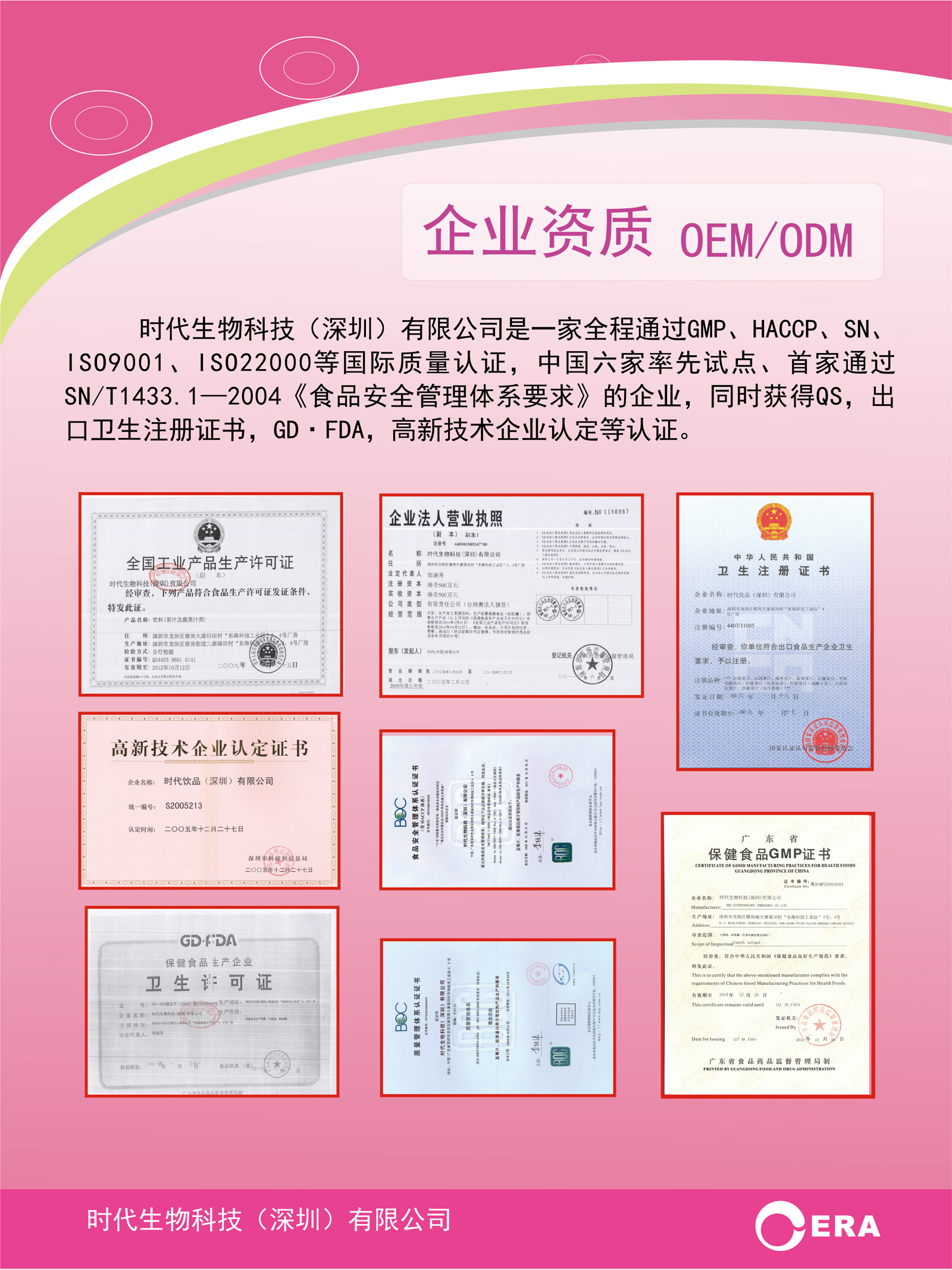 時代生物科技(深圳)有限公司打造亞洲最大膠原蛋白飲品、健康美容口服液、粉劑、軟膠囊、片劑及化妝品的研發(fā)、加工基地。建立于2003年的時代中國旗下有3個工廠:口服液生產(chǎn)廠、化妝品廠及膠囊廠。采用國際先進的現(xiàn)代化工廠管理,嚴謹?shù)馁|(zhì)量控制流程,獲得GMP、ISO9001、ISO22000、SN/T等認證。
