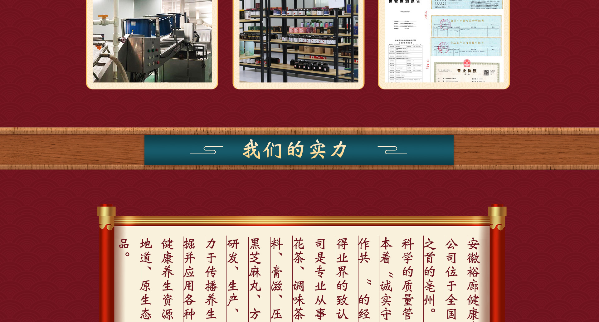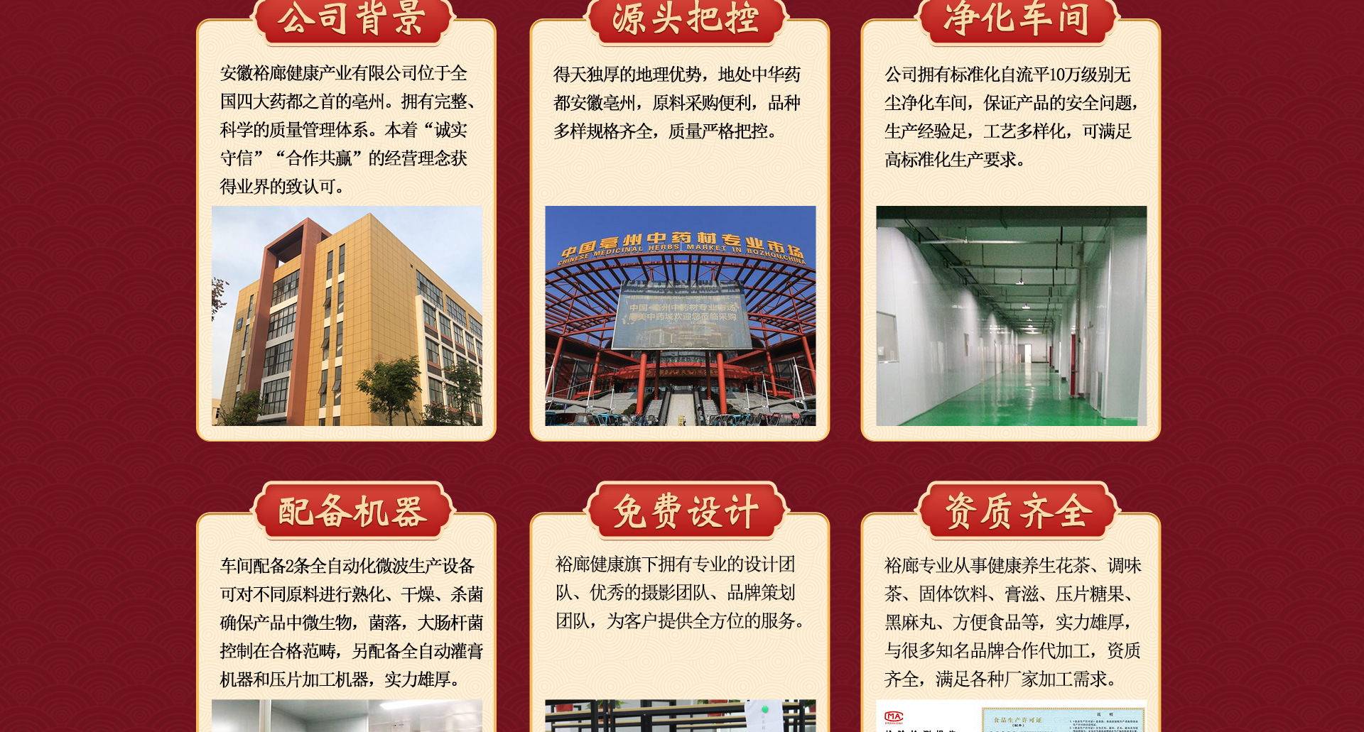 公司坐落在全球最大的中藥材集散中心---安徽亳州。主要以生產加工調味茶、代用茶、方便食品、谷物加工品等食品。坐落于全球最大的中藥材集散基地-亳州,亳州還 是神醫華佗的故鄉和中醫藥文化的發揚地之一,擁 有“華佗故里,藥材之鄉”之稱,裕廊健康生物科 技有限公司,養生中國,交通便利,環境優美,物 流發達。公司依托藥鄉,酒城,文化之都,完善的藥材和食 材等藥食同源產業鏈,為公司發展提供強勁的資 源保障,公司成立于2018年,廠房面積達一萬八千 平方,生產車間達八千余平方,凈化車間2千余平方 冷庫車間九百余平方循環烘干廠房兩千余平米,擁 有生產人員300多人研發,團隊數10人,OEM設計 數10人運營團隊50人,隨著企業發展逐步增加人才 年生產值達1億元左右