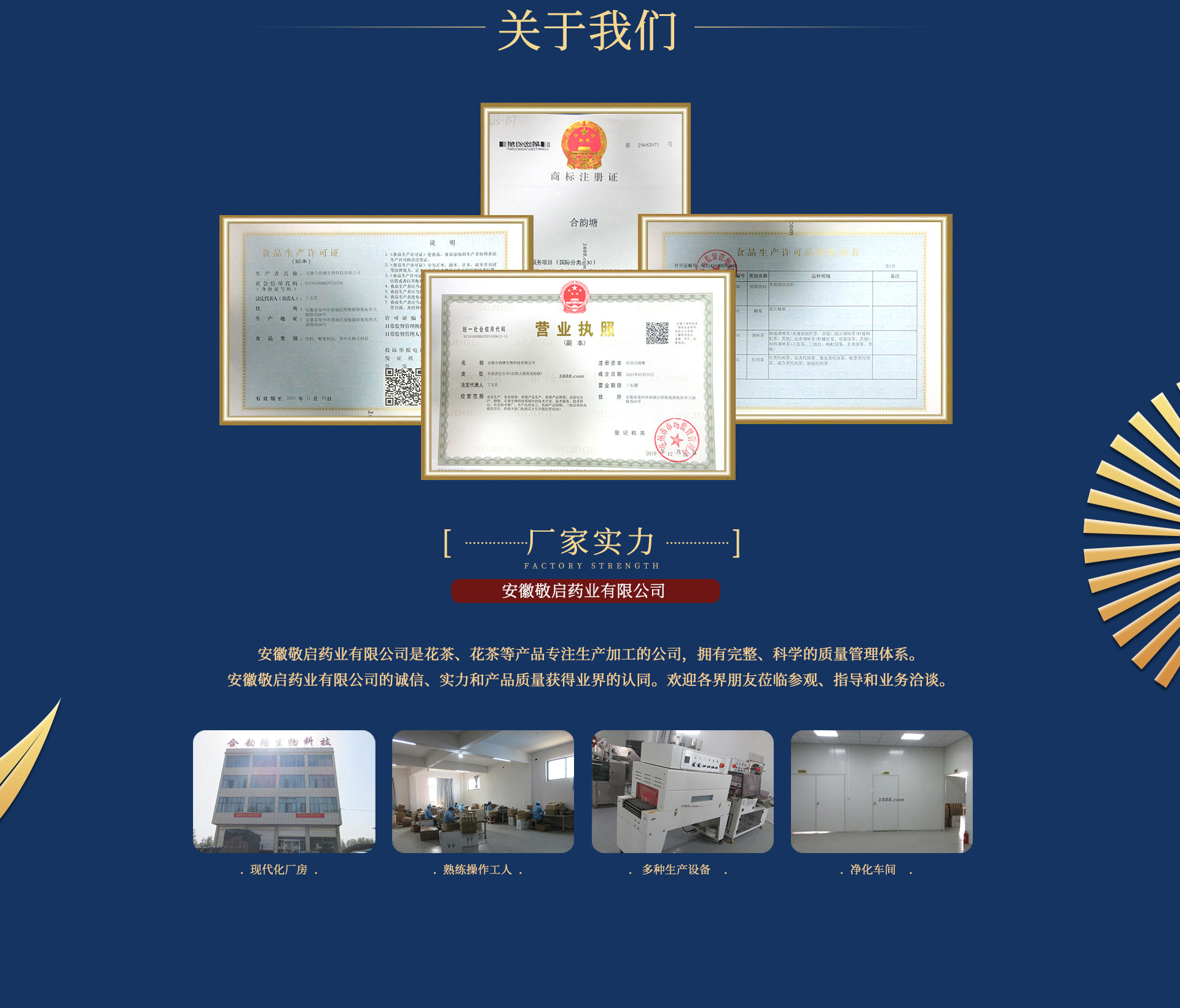 安徽敬啟藥業(yè)有限公司是代用茶、調(diào)味茶、壓片糖果、固體飲料、消字號、足浴包oem代加工等產(chǎn)品專業(yè)生產(chǎn)加工的公司,擁有完整、科學的質(zhì)量管理體系。安徽敬啟藥業(yè)有限公司的誠信、實力和產(chǎn)品的質(zhì)量獲得業(yè)界的認可,歡迎各界朋友蒞臨參觀、指導和業(yè)務洽談!
