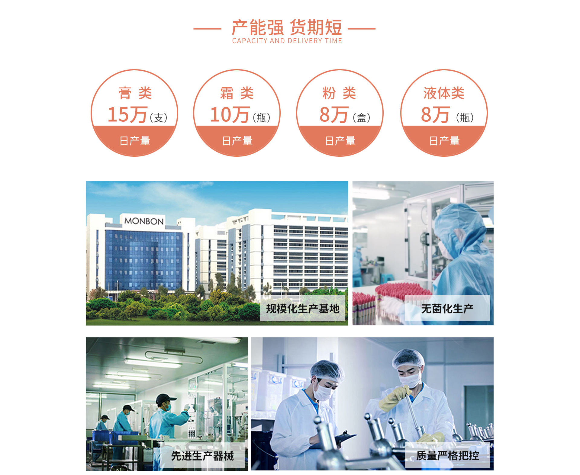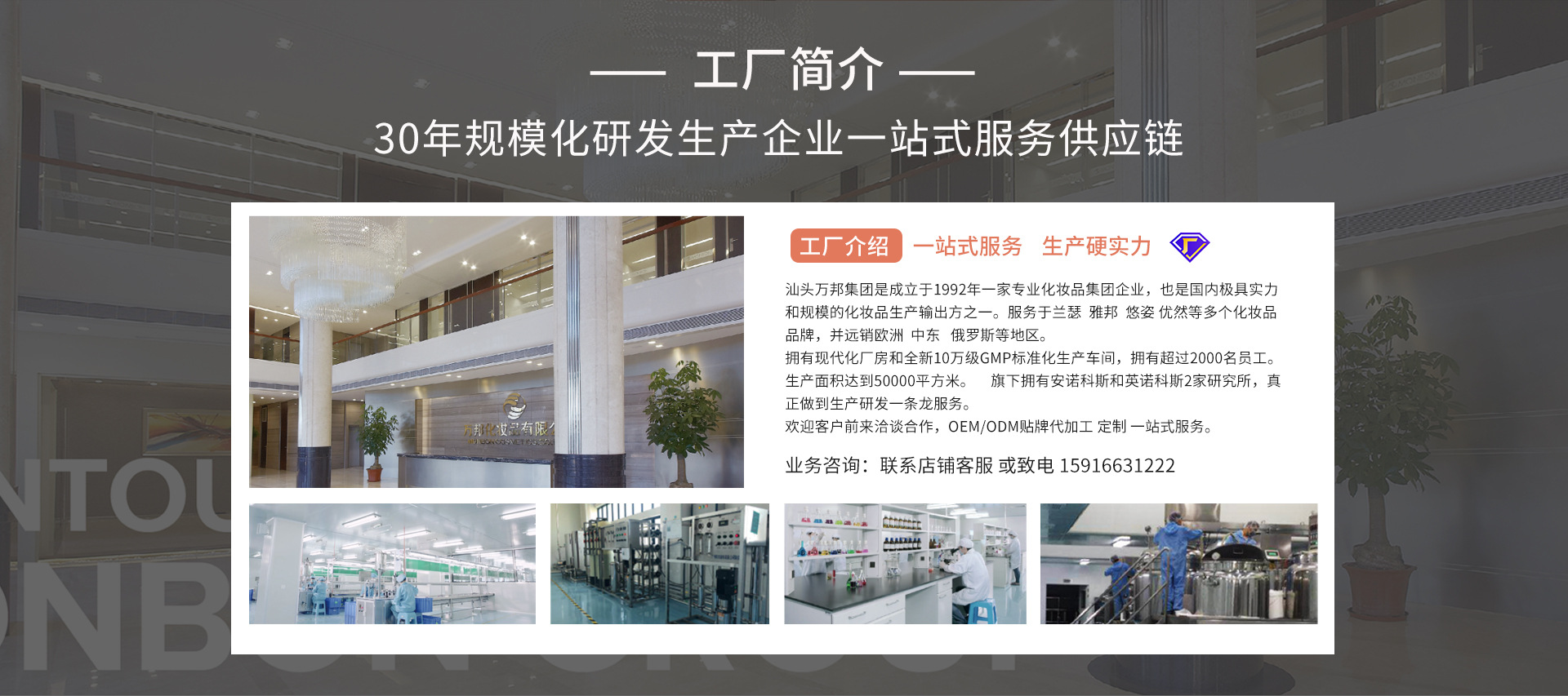 汕頭市萬邦化妝品有限公司 作為一家集化妝品研發、生產及服務為一體的專業型化妝品生產企業,一直致力并堅持以高品質、高效率的生產模式。 如今的萬邦,已擁有現代化廠房與全新的10萬級GMP標準化生產車間,生產面積達到50000平方米。 良好的生產環境、先進的儀器與設備保障了萬邦集團的高效率生產實力,而萬邦集團對產品品質的追求卻更加嚴苛、精益求精。 從原料的檢測開始,萬邦便追求卓越,選擇國際一流的原料供應商,做到一切原料可追溯。 對產品質量的監督、實驗、檢測,萬邦更是從不懈怠,獲得ISO9000:2008、ISO22716、GMPC等多項認證;從生產、質檢再到驗收,20年如一日,在萬邦,品質是企業的根基,也正是對品質孜孜不倦的追求,讓萬邦成為卓越品質的象征和符號。 而萬邦能做到的遠不止高品質、高效率的生產,先進的設計研發水平與倉儲、運輸能力,也是萬邦獨有的優勢。