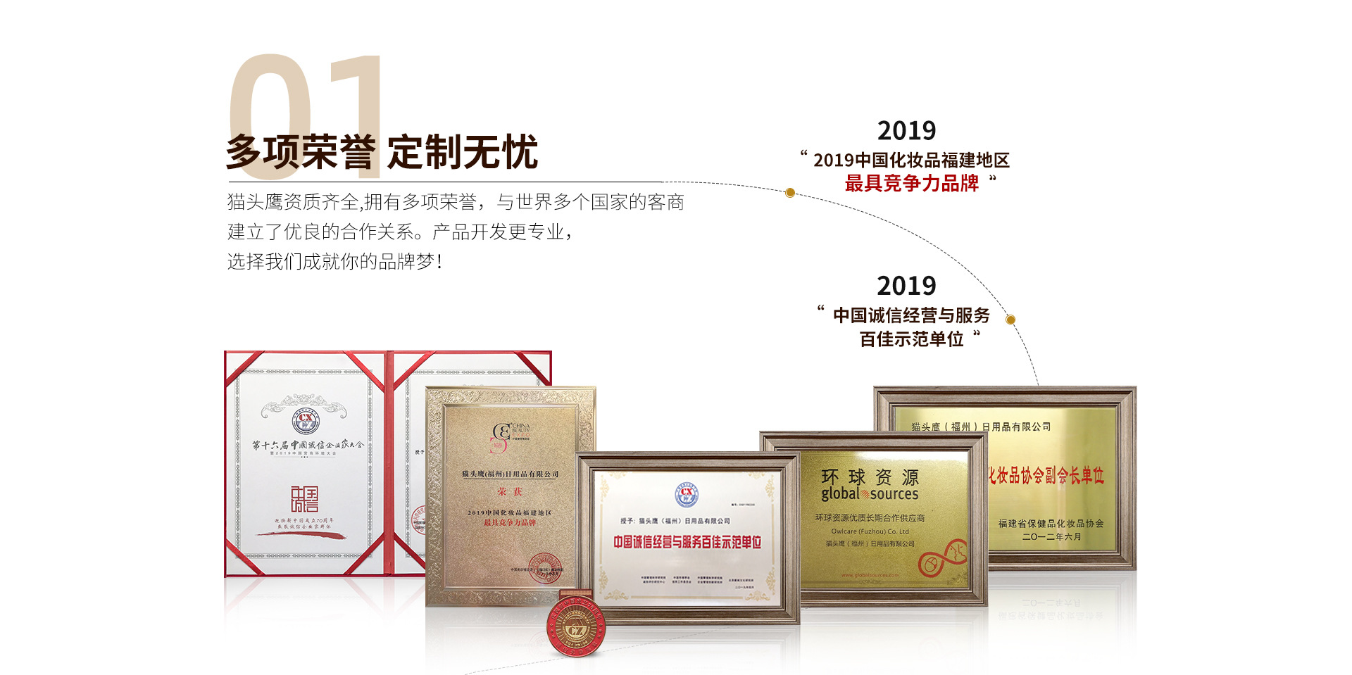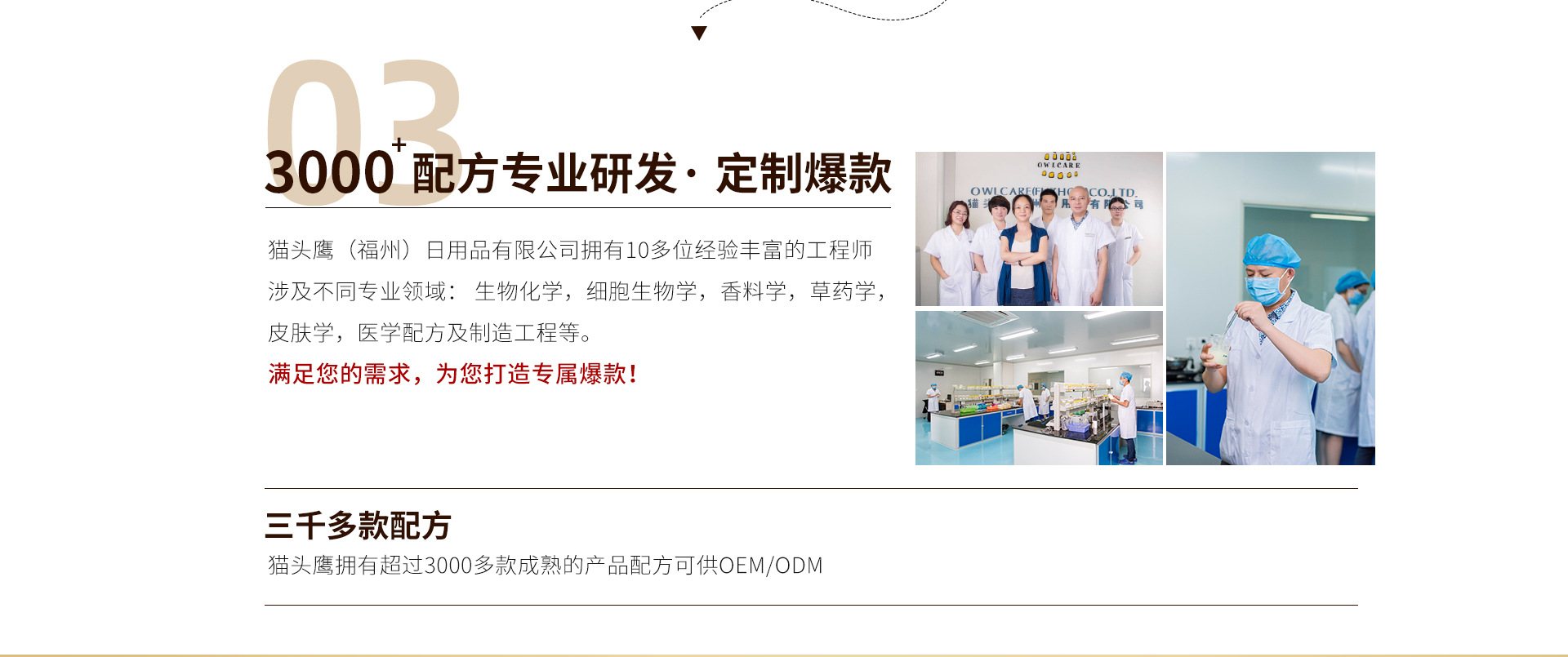 貓頭鷹(福州)日用品有限公司主要從事日化用品的研發(fā),生產(chǎn)和銷售。公司擁有十多位經(jīng)驗豐富的工程師,并與各科研機構(gòu)與高校建立聯(lián)合實驗室,將產(chǎn)品的研發(fā)和品質(zhì)放在首位,截止目前已擁有三千多款自研配方。同時擁有先進的生產(chǎn)工藝和標(biāo)準(zhǔn)的檢測系統(tǒng):1-10萬級凈化車間、先進的制造設(shè)備、精密的檢測儀器、標(biāo)準(zhǔn)現(xiàn)代化化妝品實驗室等。 公司秉承“以人為本,科學(xué)管理,技術(shù)創(chuàng)新,客戶至上”的經(jīng)營理念,為國內(nèi)外日化線、專業(yè)線、電商、微商、直銷品牌等客戶提供專業(yè)的生產(chǎn)加工服務(wù),助力品牌發(fā)展。