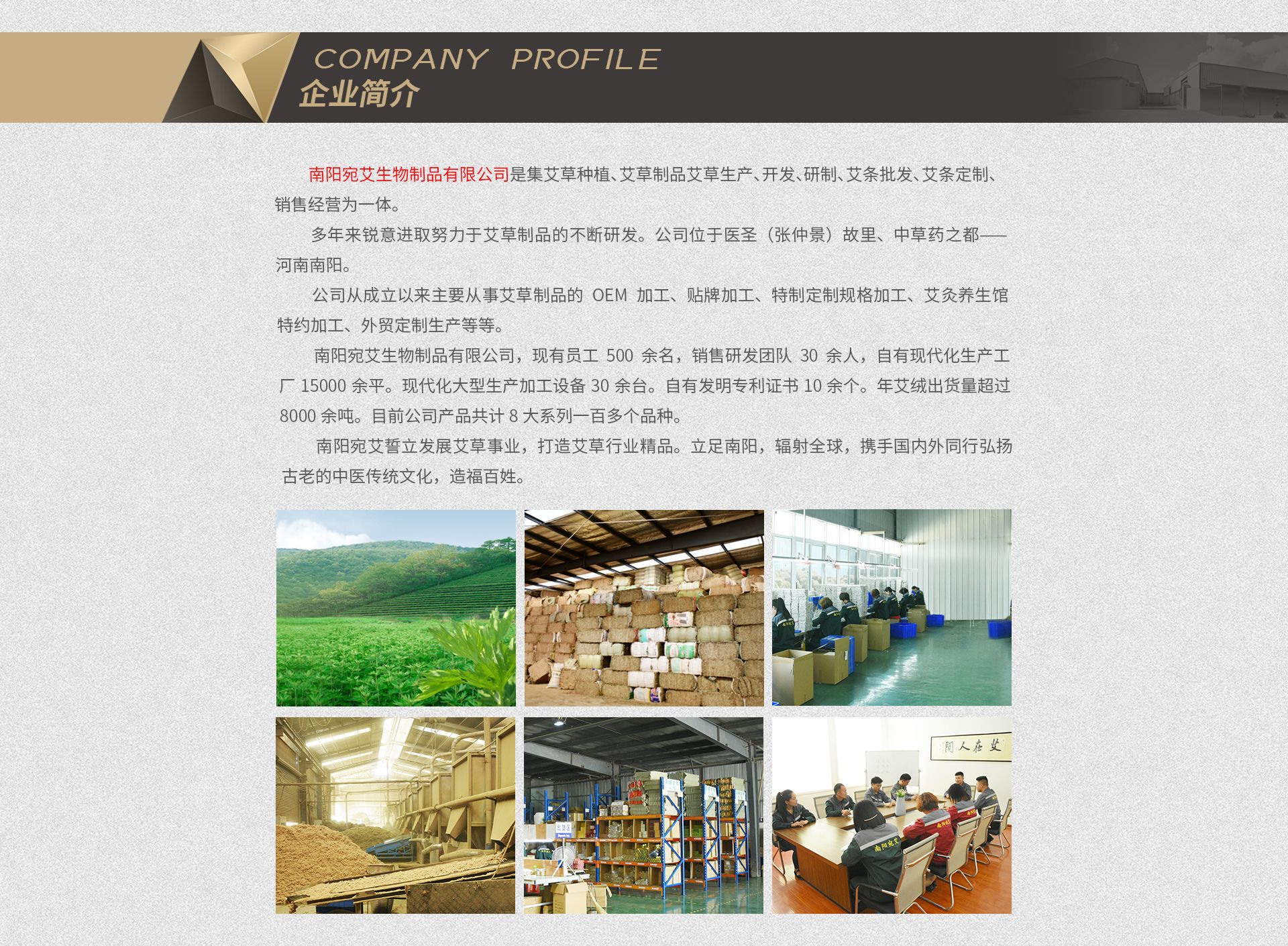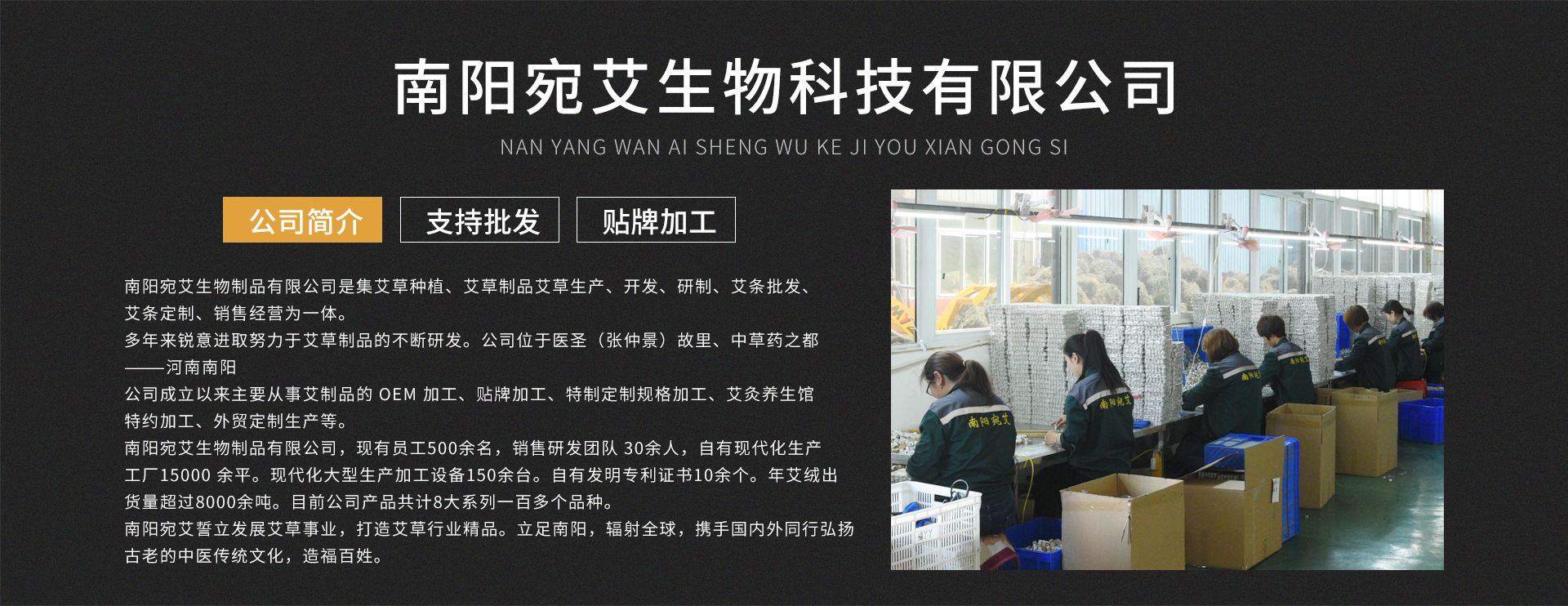 南陽(yáng)宛艾生物制品有限公司是泡腳足浴包、泡澡沐浴包、艾條、艾柱、艾絨、無(wú)煙艾條等代工定制產(chǎn)品專業(yè)生產(chǎn)加工的公司,擁有完整、科學(xué)的質(zhì)量管理體系。南陽(yáng)宛艾生物制品有限公司的誠(chéng)信、實(shí)力和產(chǎn)品質(zhì)量獲得業(yè)界的認(rèn)可。歡迎各界朋友蒞臨參觀。