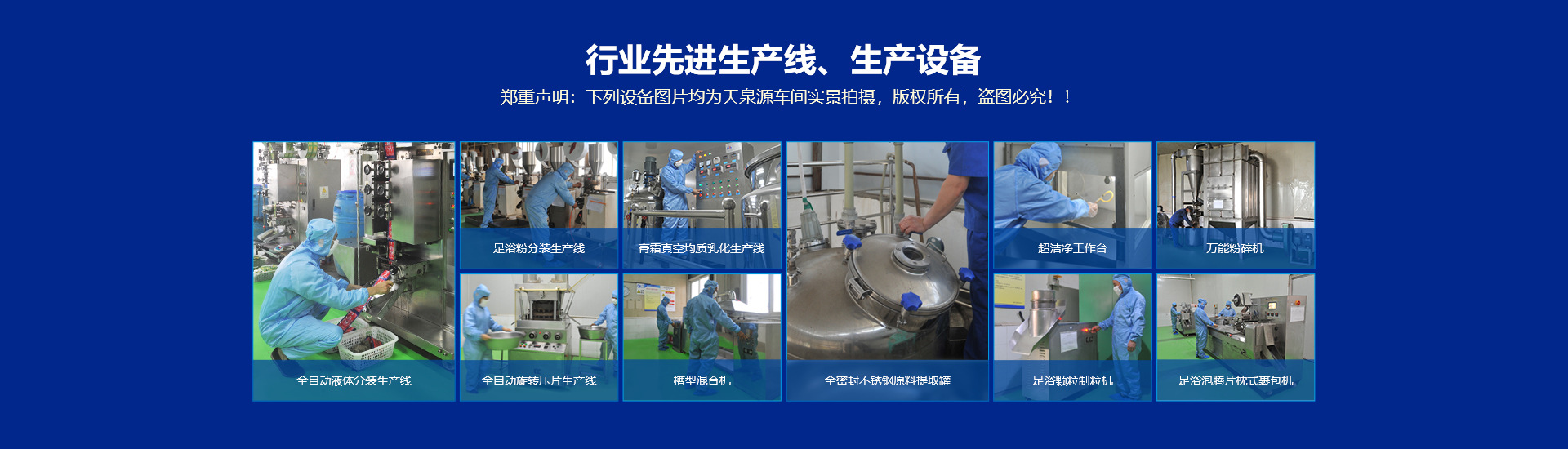 成都天泉源藥業有限公司成立于2003年,位于山清水秀的都江堰,是集“足浴、洗浴”系列產品研發、生產、銷售于一體的綜合性生產企業。公司于2013年組建電商團隊,2014年開啟阿里巴巴平臺業務,開啟零售、批發、貼牌定制三維立體發展之路,為提升企業核心競爭力,公司于2019年3月正式更名為成都天泉源藥業有限公司。 公司建成浴足粉、泡騰浴足片、浴足液、浴足顆粒、足貼、噴液、浴鹽、膏霜等10余條成熟的專業生產線。2018年改造升級可視化車間,按照GMP標準改造,方便客戶深度驗廠、參觀。 公司成立至今,積累了豐富的產品研發及生產經驗,至今已為數百家企業提供了個性化產品定制服務,從配方、原料、包材、生產到運輸、售后一條龍服務,解決客戶的后顧之憂。 公司發展至今,歷經行業多次變革,在優勝劣汰的行業浪潮中攻堅克難、領航前行。公司秉承“開拓創新、誠信經營、客戶至上”的宗旨,歡迎各界朋友蒞臨參觀、洽談合作。
