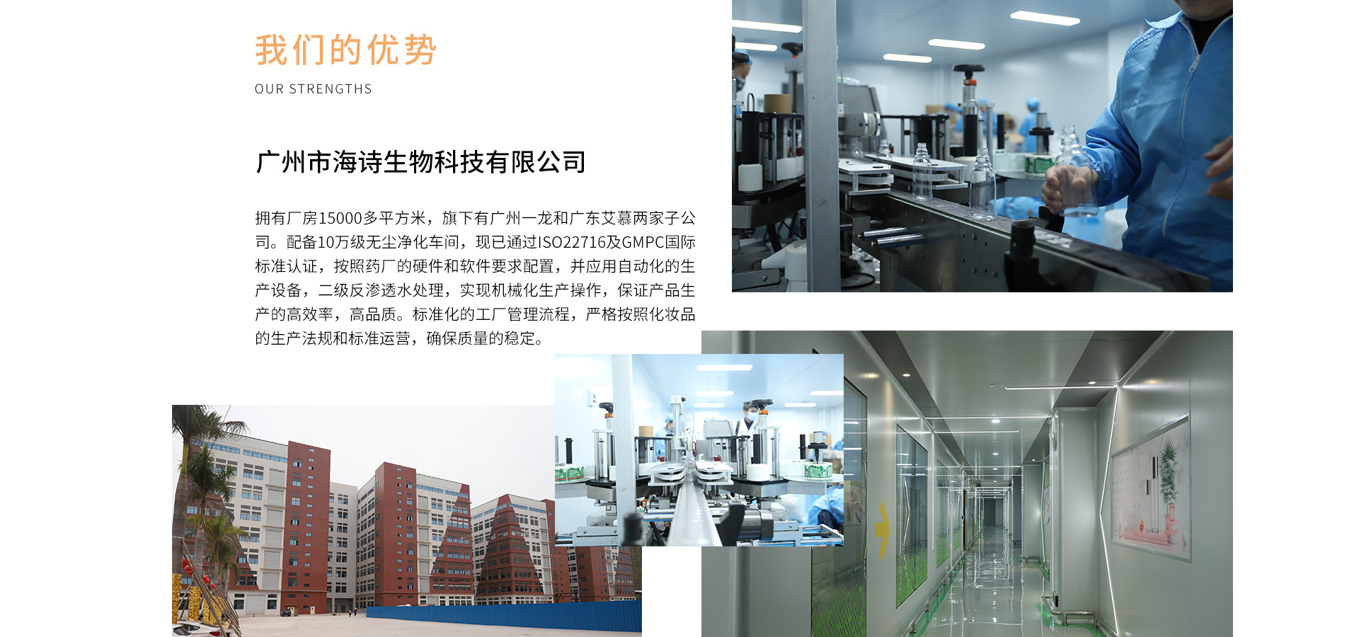 廣州市海詩生物科技有限公司擁有廠房15000多平方米,旗下有廣州一龍和廣東艾慕兩家子公司。配備10萬級無塵凈化車間,現已通過ISO22716及GMPC國際標準認證,按照藥廠的硬件和軟件要求配置,并應用自動化的生產設備,二級反滲透水處理,實現機械化生產操作,保證產品生產的高效率,高品質。標準化的工廠管理流程,嚴格按照化妝品的生產法規和標準運營,確保質量的穩定。 公司擁有自己的分析測試中心,同時實驗室配置了氣相色譜儀,液相色譜儀,紅外光譜儀,薄層色譜像儀、熔點儀等專業檢測設備,不僅可以做化妝品的常規理化測試,微生物測試,還可以獨立完成化妝品的成分功效等專業測試,確保產品處于受控狀態。