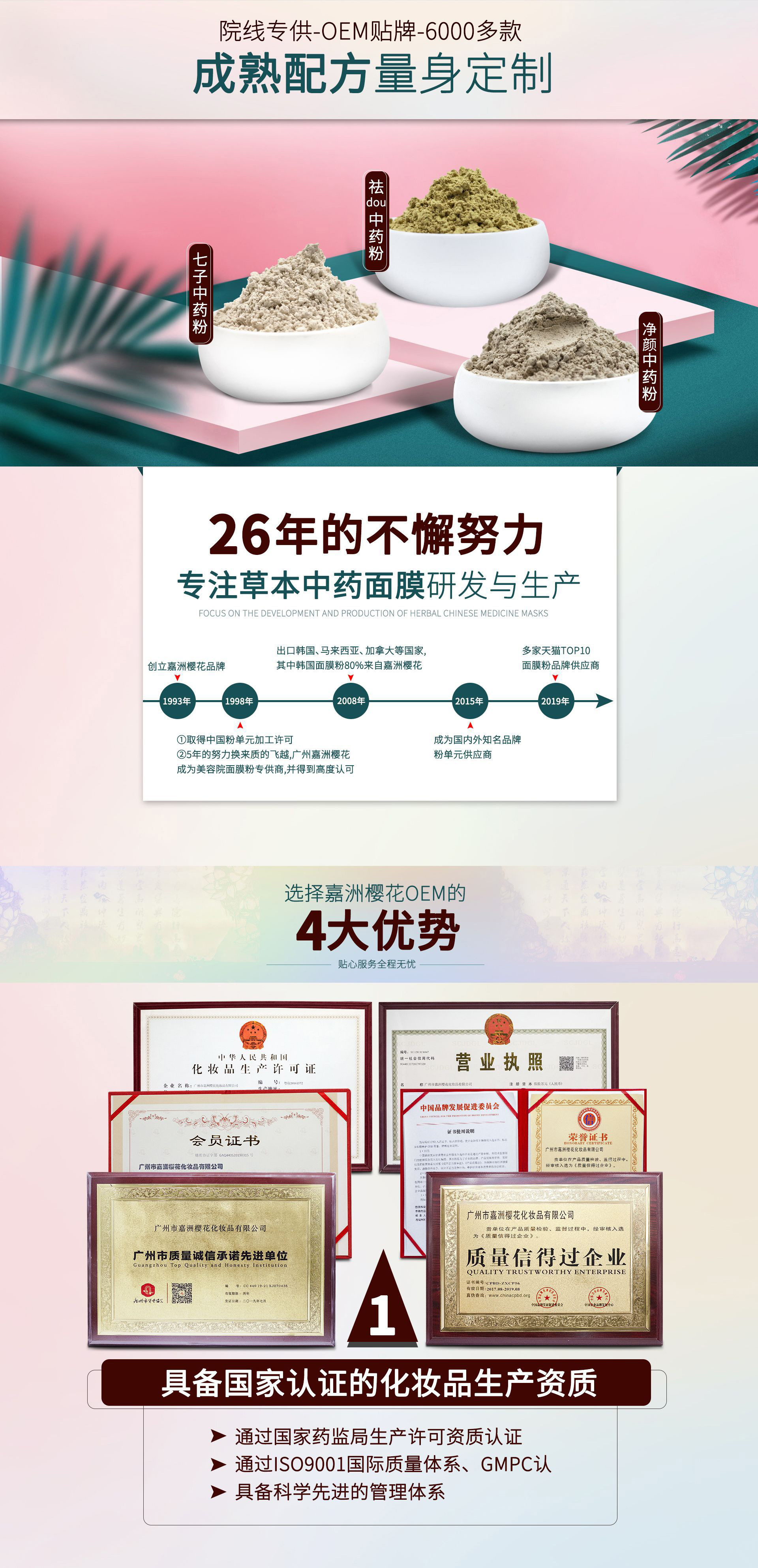 廣州嘉洲櫻花化妝品有限公司工貿實體創建于1993年,是一家集研發、生產為一體的專業化妝品企業,提供批發、零售、代理和代加工貼牌OEM/ODM服務,主營皮膚用化學品,洗面奶,面膜,護膚乳液,化妝品套裝等護膚品。工廠生產面積達14000平方米,環境優美,擁有完整、科學的質量管理體系。產品贏得全國一百多個大中小城市客戶的信賴,并長期遠銷美國,加拿大,歐洲,韓國,日本等東南亞國家。現已跟國際國內好多知名品牌合作提供OEM業務。誠信、實力和產品質量獲得業界的認可。 我公司堅持以誠信經營,顧客至上為宗旨,將不斷學習、不斷創新上下同心同德,決心用實際行動來打造出超越顧客期望的護膚產品服務來引領市場,歡迎各界朋友蒞臨參觀、指導和業務洽談。