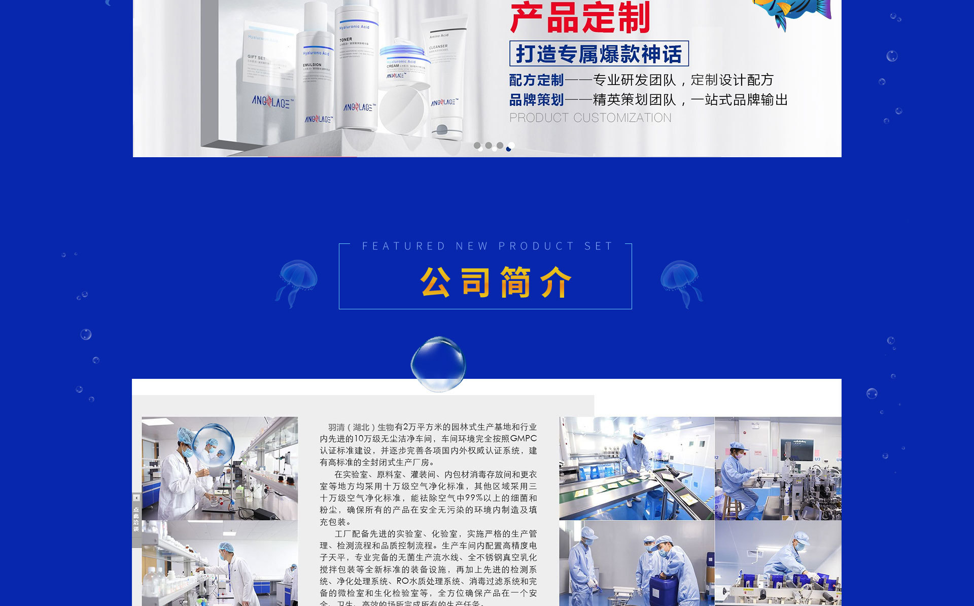 羽清湖北生物制品有限公司成立于2019年10月.本公司是一家集研發,生產、銷售、加盟連鎖于一體的一站式服務、高端美容體驗、美業人才輸出型企業;涵蓋了OEM,ODM加工領域,擁有行業先進水平的研發中心和生產基地,嚴格按照國家標準配有10萬級凈化車間,各類先進的自動化生產設備,產品覆蓋水霜乳膏套盒系列,以各大電商平臺,直銷,連鎖加盟等主要銷售渠道為載體。秉承誠信為本的原則,誠邀您的業務接洽。羽清實業是一家連通線上線下,集化妝品、大健康產品研發、生產、教育、物流倉儲等為一體的綜合型供應鏈企業。第一期羽清生物座落于英雄之地湖北赤壁,2020年11月正式取得化妝品生產經營許可資格,公司嚴格按照國家標準,配有10萬級凈化車間和多種自動化生產設備。羽清生物專注于各類護膚、養生、護發、清潔產品等的OEM、ODM加工