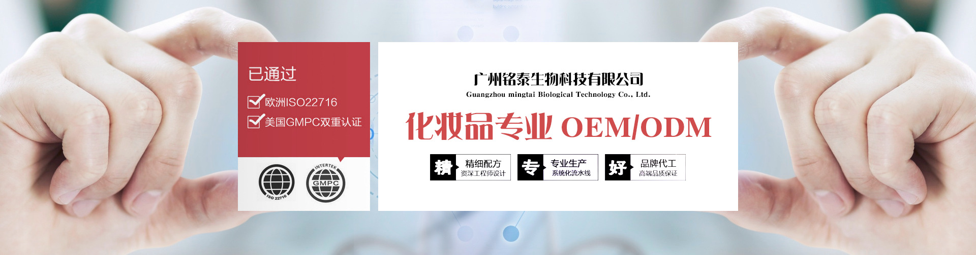 廣州銘泰生物科技有限公司是護膚品OEM、眼部護理OEM、手部護理OEM、面部護理OEM、身體護理OEM、彩妝OEM、洗護OEM等產品專業生產加工的公司,擁有完整、科學的質量管理體系。廣州銘泰生物科技有限公司的誠信、實力和產品質量獲得業界的認可。歡迎各界朋友蒞臨參觀、指導和業務洽談。