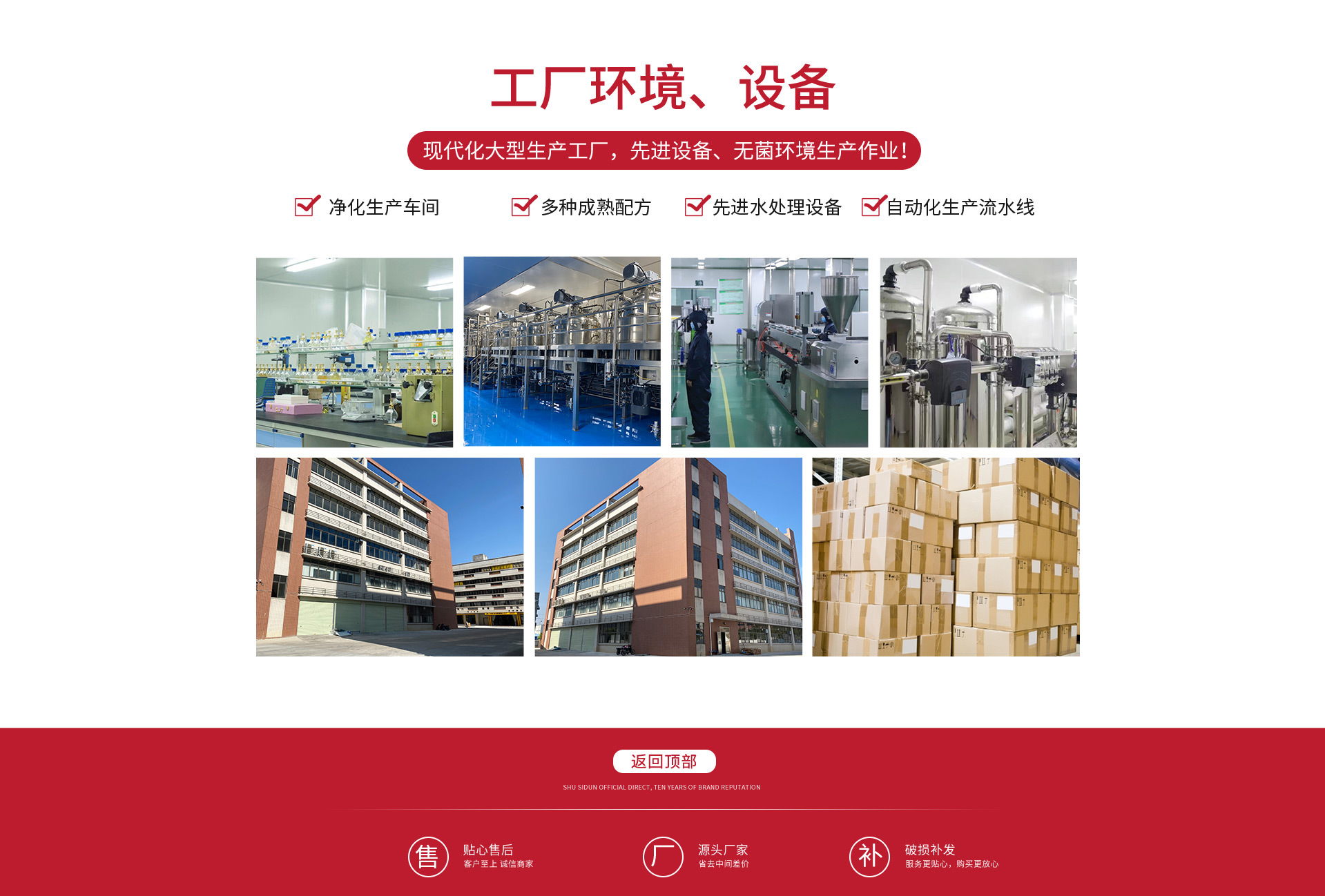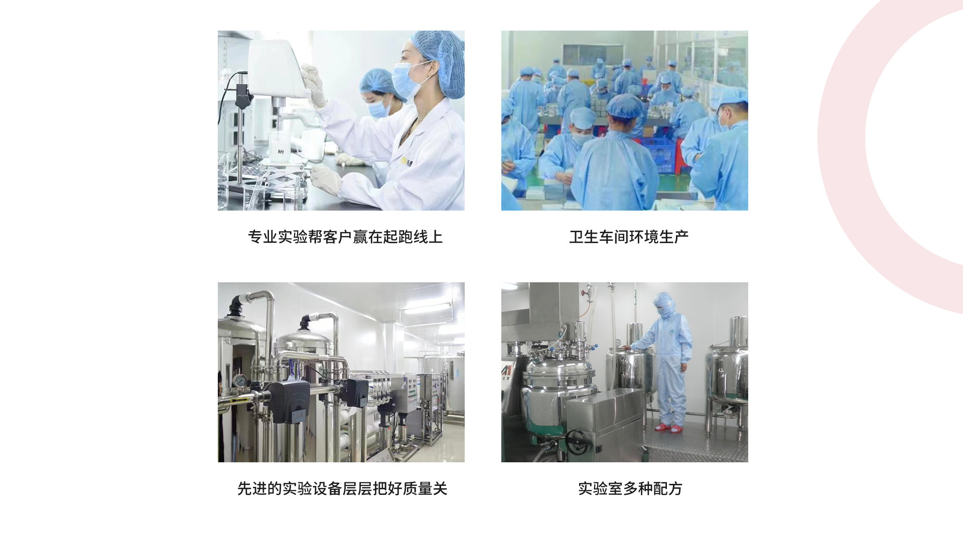 1)一流的生產環境設備。公司擁有10萬級無塵菌化實驗室、2000平方米的10萬級無塵凈化生產車間。主要的生產和灌裝設備來自意大利、德國、臺灣。研發,生產,包裝等管理和操作流程都達到國際質標準。工廠日產能可達10萬片(面膜),9噸膏霜,20噸乳液以上。