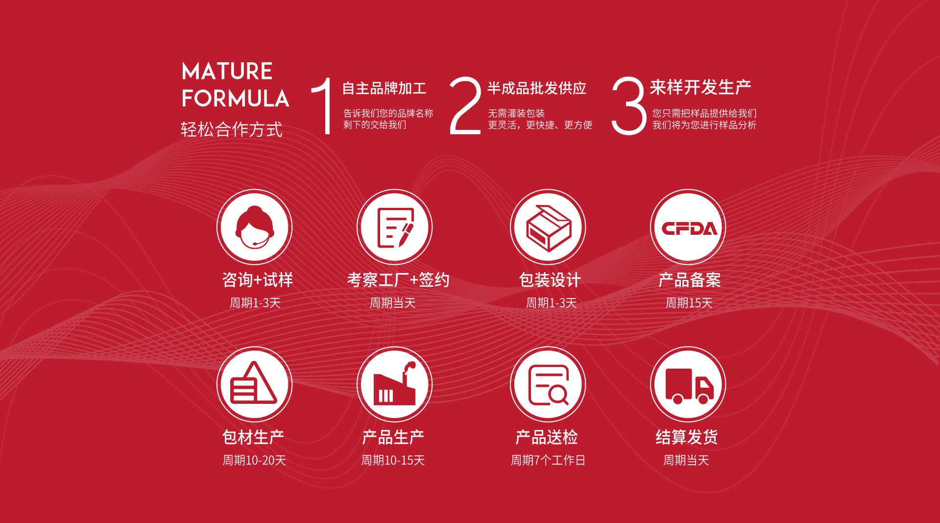 公司完善的ODM/OEM服務體系,吸引了眾多國內外的客戶來我司進行ODM/OEM代工,并為其提供切合需求的、極具個性化的服務。自成立以來,在產品品種上積極開拓進取,已成功推出了上萬種有成熟配方的產品,其中既有尖端的高科技產品,也有大眾化日常護理品,成功協助國內外80多個化妝品品牌上市及并獲得不俗反響。 公司始終秉承“以創新為導向,以雙贏為目的,以質量為核心,以服務為手段”的經營理念, 在原料的選擇上,秉承“安全、有效”的新時代美容理念,采用世界優質安全原料。選用綠色植物、高科技因子、中藥等各種先進的配方,嚴格杜絕對肌膚存在任何安全隱患的成分原料。物別針對各種問題性肌膚的修護方面,更是不遺余力地鉆研、探索,在對精心研制出最適合東方女性的新時代美容護膚精品,做出不懈的努力。 在以“一站式服務,讓您輕松擁有品牌”的經營理念下,我們徹底實現了工廠的精準化、效率化、流程化的管理。