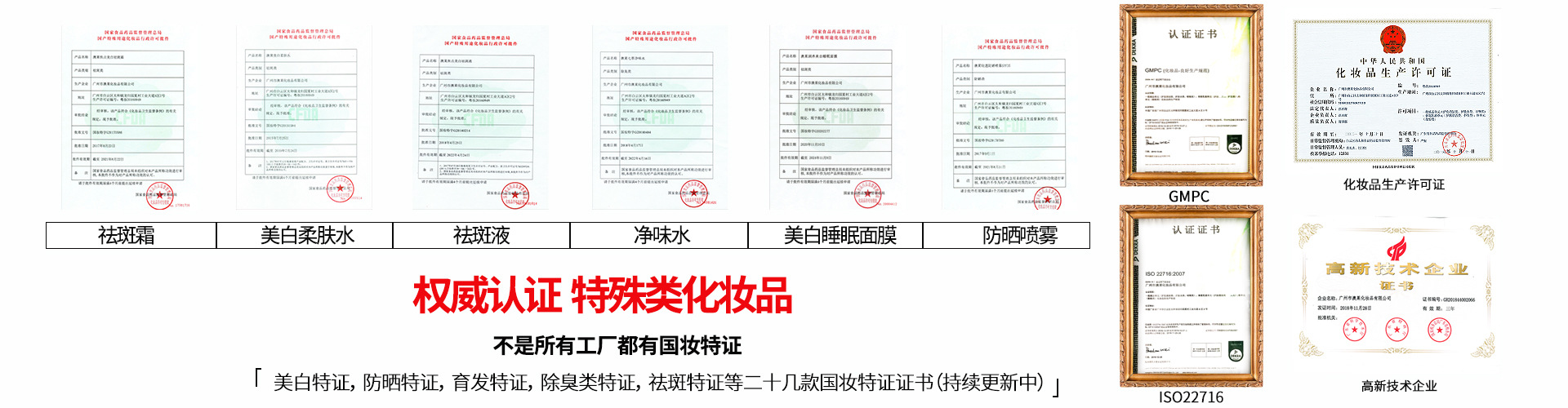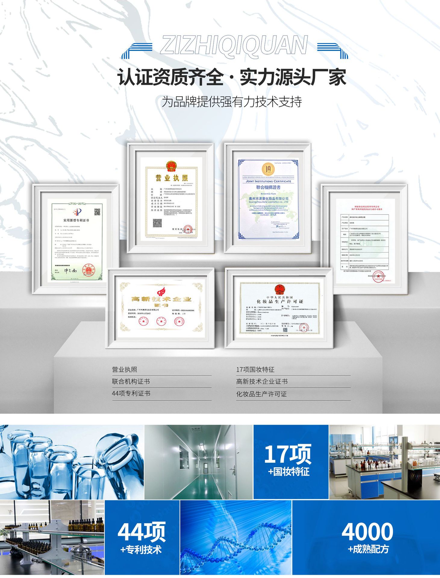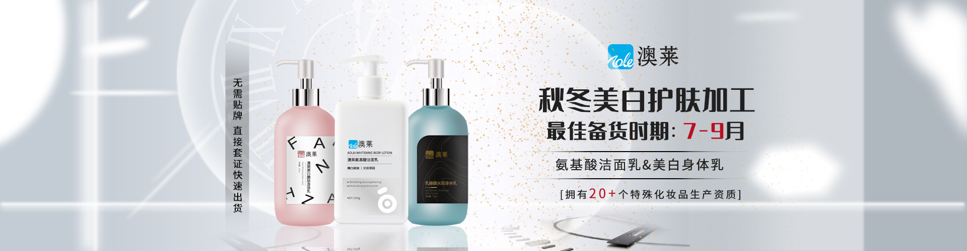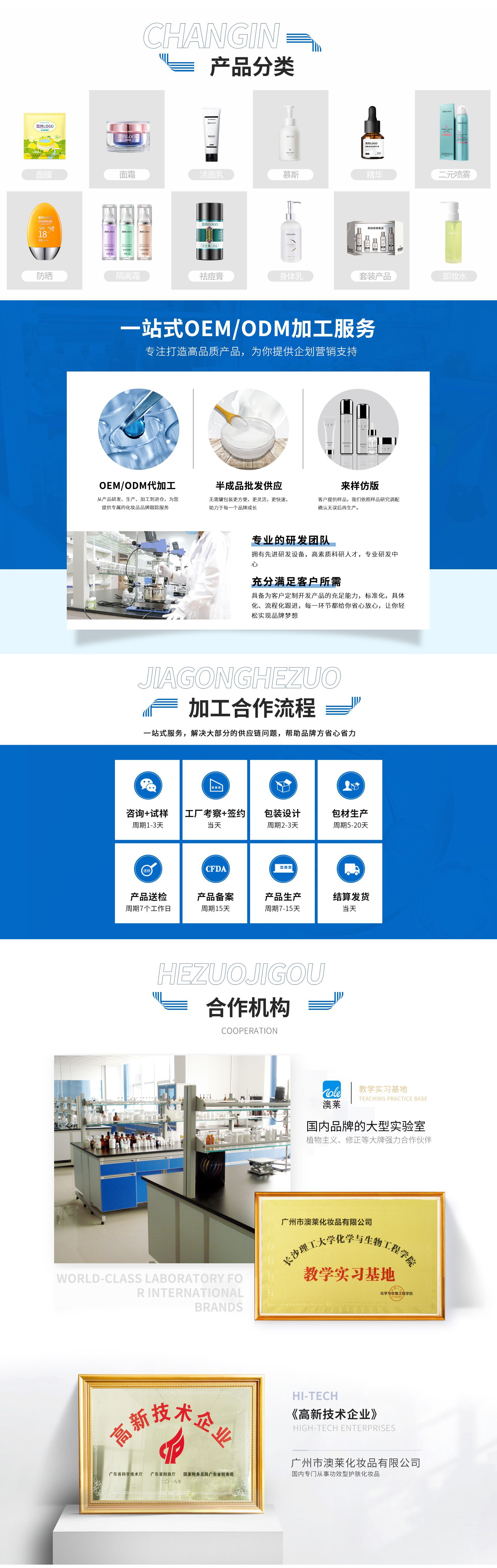 廣州市澳萊化妝品有限公司──專注于護膚領域的化妝品OEM/ODM專業制造企業,集產品技術研發、加工生產、營銷推廣于一體,產品涉及基礎護膚類、二元噴霧類、美白祛斑類、隔離防曬類、祛痘抗敏修護類。 軟件方面:已獲得歐盟( ISO22716 )和美國(GMPC )的雙重認證,以及國家高新技術企業證書;并擁有多名資深研發工程師,開發人員及強大的銷售服務團隊。累計沉淀多達4000多個成熟配方,52項發明專利和17個特證。 硬件方面:工廠擁有12000平方米的GMPC標準生產廠房,以及配套的相關乳化設備,二級反滲透純水裝置,10萬級潔凈生產車間,高效空氣凈化中央空調系統,水劑類、膏霜乳液類、散粉類、洗滌類生產灌裝車間,面貼膜包裝生產線、二元包裝灌裝全自動設備等。按國家環保要求安裝一級污水處理裝置。科學的管理及健全規范的質量體系,為客戶提供高品質化妝品加工服務。