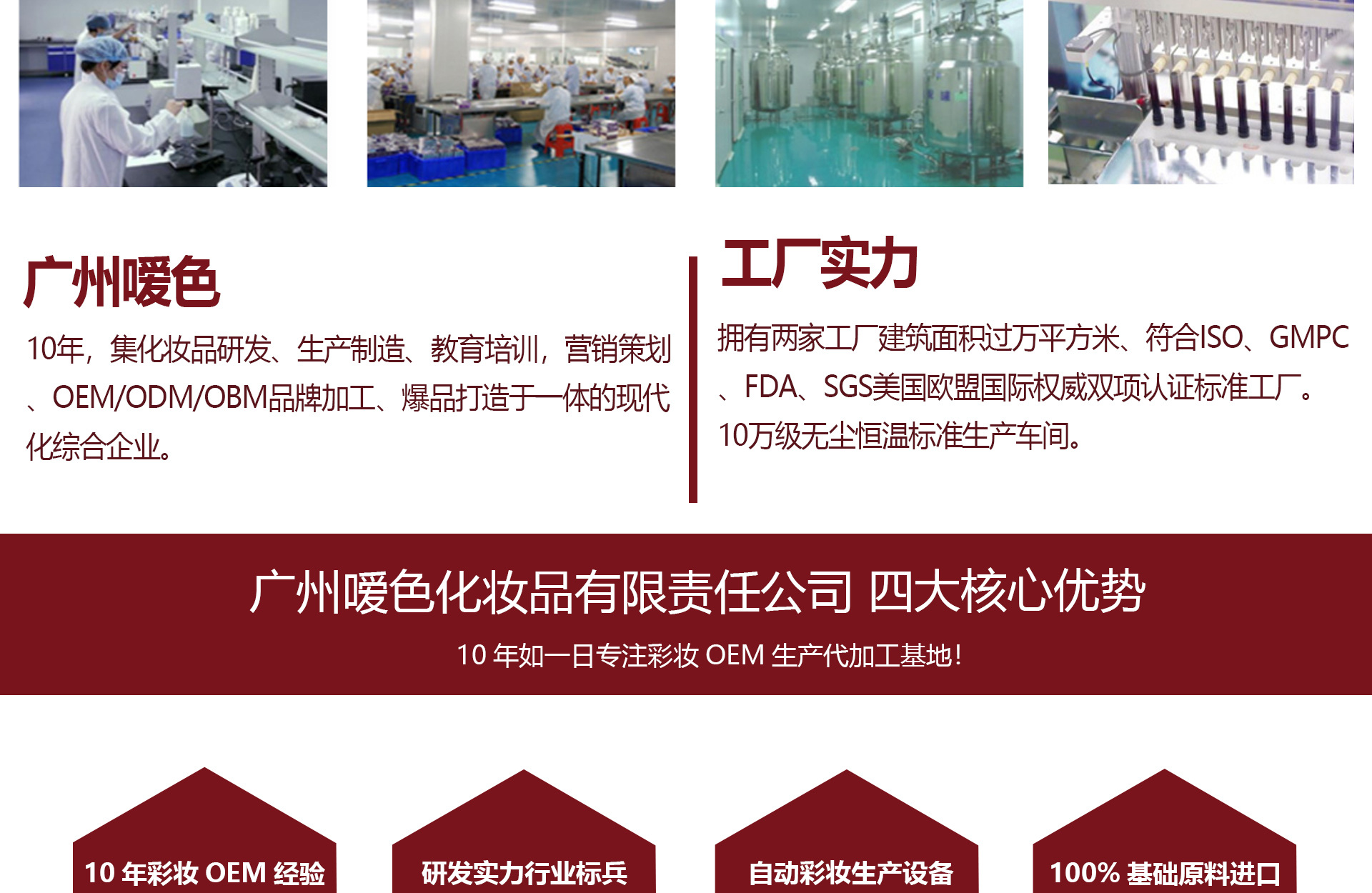 廣州噯色化妝品有限責任公司 廣州市噯色化妝品有限責任公司是一家主要從事彩妝OEM/OEM/OBM及高端彩妝配方的研發、生產貼牌、銷售的綜合性現代化企業。 公司已有十二年針對彩妝粉塊、彩繪油膏、蠟基唇部彩妝產品研發基礎,有多條專業生產線,以先進的化妝品生產設備和專業的研發團隊為依托,并擁有完整的科學的質量管理體系,嚴格管理和保證品質。公司采用日本精益化管理模式管理工廠,10000平米廠房按歐盟GMPC十萬級凈化標準要求設計,基地擁有30的研發人員及最專業的化妝品服務團隊,能夠快速為客戶提供個性化訂制配方、市場策劃 、包材訂購等服務