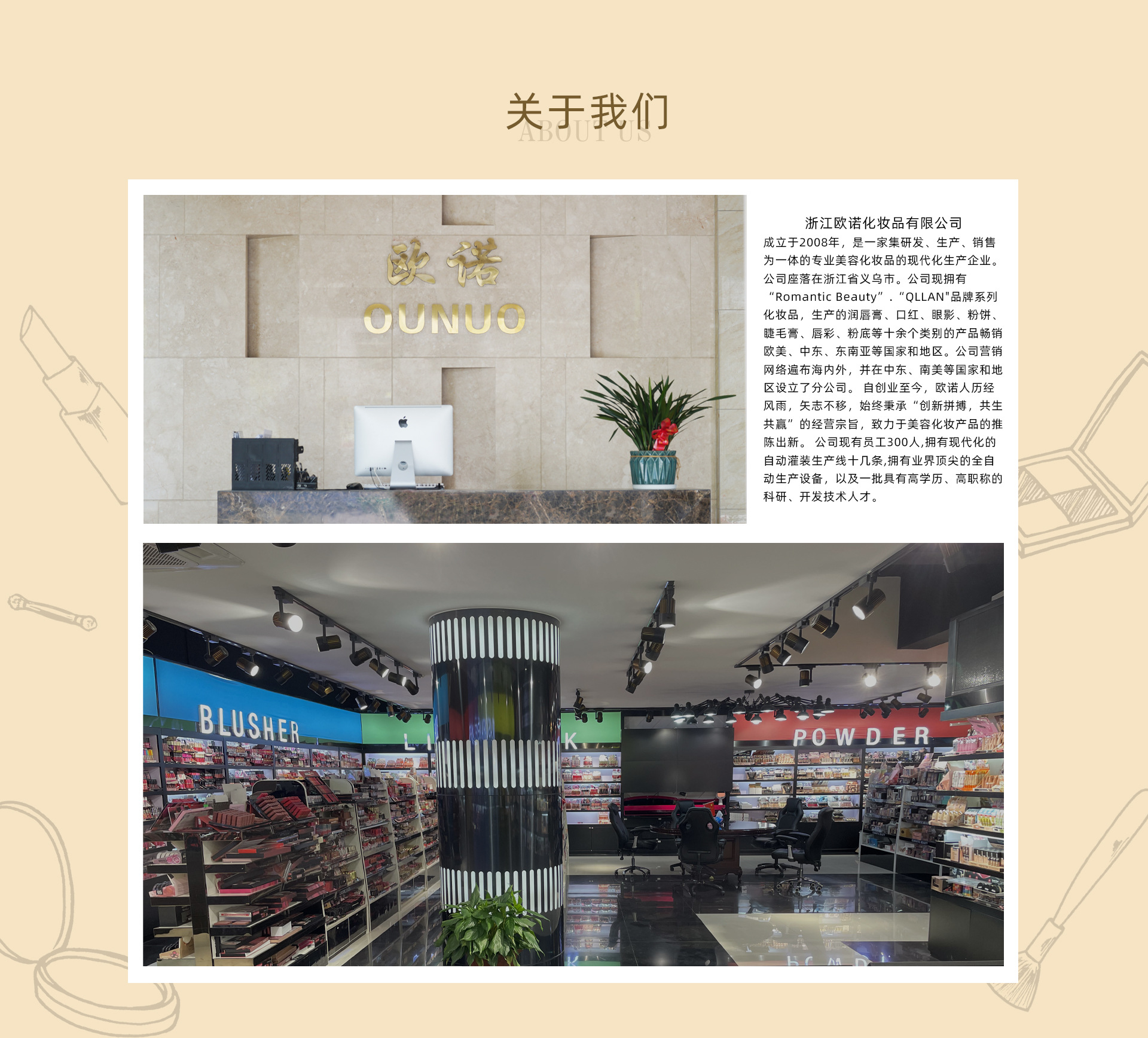 浙江歐諾化妝品有限公司成立于2008年,是一家集研發、生產、銷售為一體的專業美容化妝品的現代化生產企業。公司座落在浙江省義烏市柳青工業區川塘路88號。公司現擁有 “Romantic Beauty”.“QLLAN"品牌系列化妝品,生產的潤唇膏、口紅、眼影、粉餅、睫毛膏、唇彩、粉底等十余個類別的產品暢銷歐美、中東、東南亞等國家和地區。公司營銷網絡遍布海內外,并在中東、南美等國家和地區設立了分公司。 自創業至今,歐諾人歷經風雨,矢志不移,始終秉承“創新拼搏,共生共贏”的經營宗旨,致力于美容化妝產品的推陳出新。 公司現有員工300人,擁有現代化的自動灌裝生產線十幾條,擁有業界頂尖的全自動生產設備,以及一批具有高學歷、高職稱的科研、開發技術人才