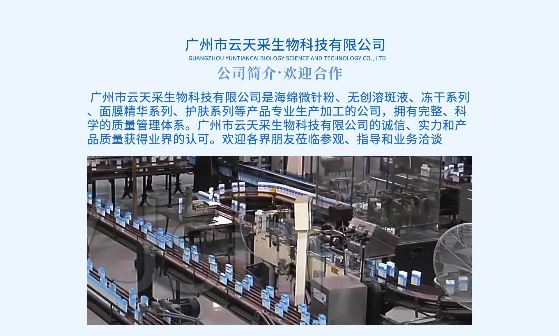廣州市云天采生物科技有限公司是海綿微針粉、無創溶斑液、凍干系列、面膜精華系列、護膚系列等產品專業生產加工的公司,擁有完整、科學的質量管理體系。廣州市云天采生物科技有限公司的誠信、實力和產品質量獲得業界的認可。歡迎各界朋友蒞臨參觀、指導和業務洽談。