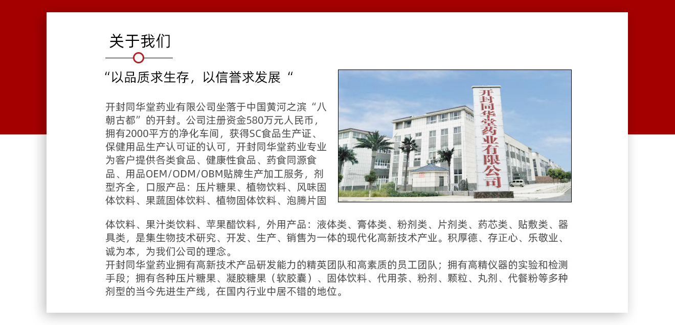 開封同華堂藥業(yè)有限公司是膠原肽白植物飲料、酵素液體飲料、人參植物飲料、維生素C泡騰片、益生菌固體飲料等產(chǎn)品專業(yè)生產(chǎn)加工的公司,擁有完整、科學(xué)的質(zhì)量管理體系。開封同華堂藥業(yè)有限公司的誠(chéng)信、實(shí)力和產(chǎn)品質(zhì)量獲得業(yè)界的認(rèn)可。歡迎各界朋友蒞臨參觀、指導(dǎo)和業(yè)務(wù)洽談。