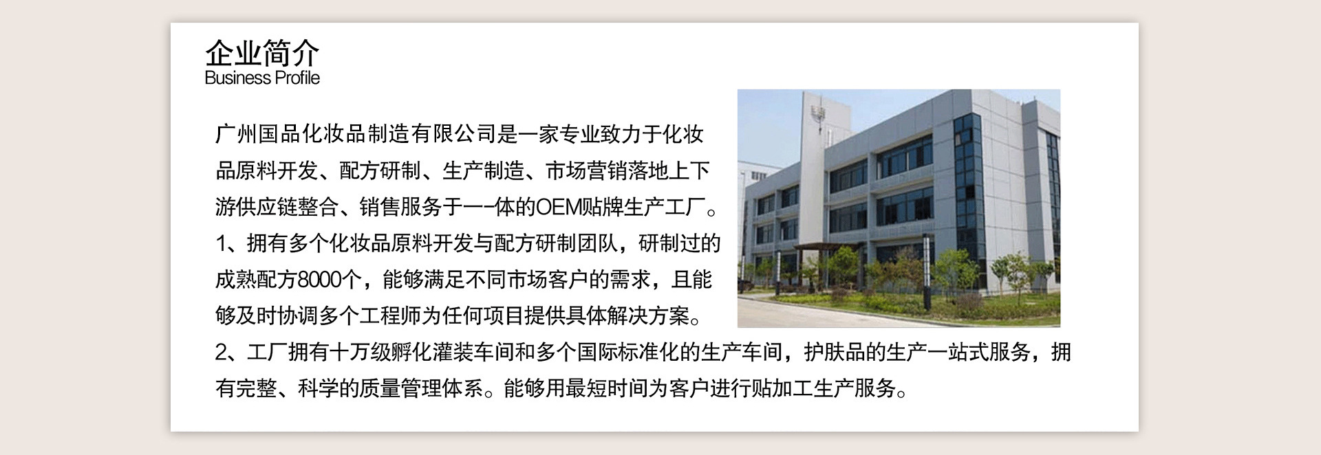 廣州國品化妝品制造有限公司是一家專業生產各類海藻面膜,蠶絲面膜紙,面膜精華液,精油藥油,花瓣面膜粉,蔬果面膜粉,精油面膜粉,出水面膜粉,水晶面膜粉,高保濕面膜粉,高強度面膜粉,中藥面膜粉,身體藥灸粉的專業廠家,我公司擁有面膜粉膜材的核心技術,做到了三年膜材沒有出過質量問題,已經非常的穩定,而且做出來的膜材跟很多原料能夠配伍,做到了配伍1:30以上,而且產品質量仍然非常穩定,無論是產品的保濕型,成膜性,韌性,絕對不會出現有疙瘩打不開的現象,而且我們擁有能夠調節凝固時間的技術,不會改變產品的性能,有些客戶會提出延長時間凝固,或者縮短凝固時間,這些問題我公司都能夠根據客戶要求來調節時間,并且能夠調控產品的加水比例,流動性,成膜性,顏色,味道等很多特點,從而控制產品的:美白,補水,消炎,抗皺性,可以為客戶量身定做適合的膜粉,為品牌的建設添一份磚瓦,歡迎各界朋友蒞臨參觀、指導和業務洽談。