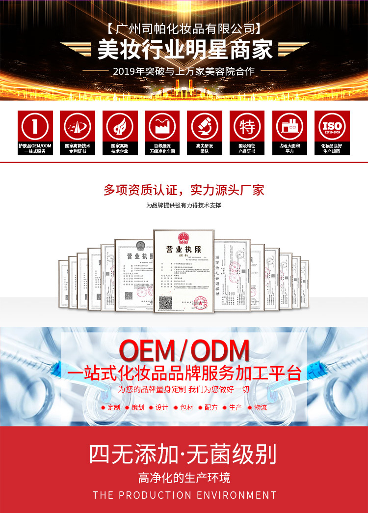 廣州司帕化妝品有限公司是一家集優質化妝品研發,生產,銷售,服務為一體的化妝品公司。專業生產加工的公司,擁有完整、科學的質量管理體系。廣州司帕化妝品有限公司以誠信、實力和產品質量獲得業界的認可。歡迎各界朋友蒞臨參觀、指導和業務洽談。