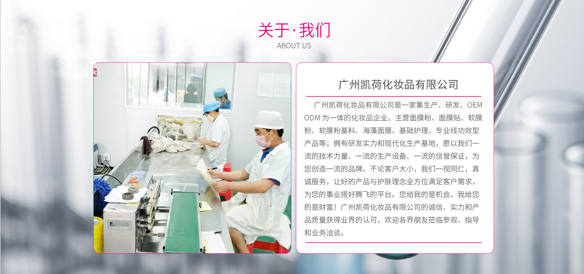 廣州凱荷化妝品有限公司是一家集生產、研發、OEM ODM 為一體的化妝品企業。主營面膜粉、面膜貼、軟膜粉、軟膜粉基料、海藻面膜、基礎護理、專業線功效型產品等;擁有研發實力和現代化生產基地,愿以我們一流的技術力量、一流的生產設備、一流的信譽保證,為您創造一流的品牌。不論客戶大小,我們一視同仁,真誠服務,讓好的產品與護膚理念全方位滿足客戶需求,為您的事業搭好騰飛的平臺。您給我的是機會,我給您的是財富!廣州凱荷化妝品有限公司的誠信、實力和產品質量獲得業界的認可,歡迎各界朋友蒞臨參觀、指導和業務洽談。