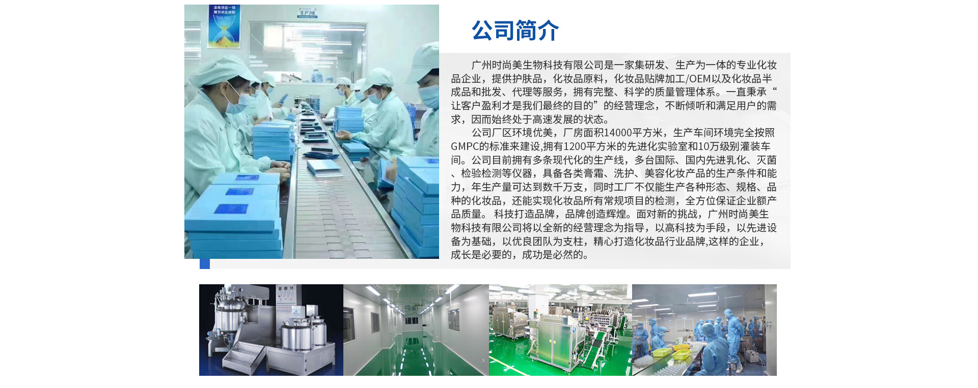 廣州時尚美生物科技有限公司是一家集研發、生產為一體的專業化妝品企業,提供護膚品,化妝品原料,化妝品貼牌加工/OEM以及化妝品半成品和批發、代理等服務,擁有完整、科學的質量管理體系。一直秉承“讓客戶盈利才是我們最終的目的”的經營理念,不斷傾聽和滿足用戶的需求,因而始終處于高速發展的狀態。公司廠區環境優美,廠房面積14000平方米,生產車間環境完全按照GMPC的標準來建設,擁有1200平方米的先進化實驗室和10萬級別灌裝車間。公司目前擁有多條現代化的生產線,多臺國際、國內先進乳化、滅菌、檢驗檢測等儀器,具備各類膏霜、洗護、美容化妝產品的生產條件和能力,年生產量可達到數千萬支,同時工廠不僅能生產各種形態、規格、品種的化妝品,還能實現化妝品所有常規項目的檢測,全方位保證企業額產品質量。 科技打造品牌,品牌創造輝煌。面對新的挑戰,廣州時尚美生物科技有限公司將以全新的經營理念為指導,以高科技為手段,以先進設備為基礎,以優良團隊為支柱,精心打造化妝品行業品牌,這樣的企業,成長是必要的,成功是必然的