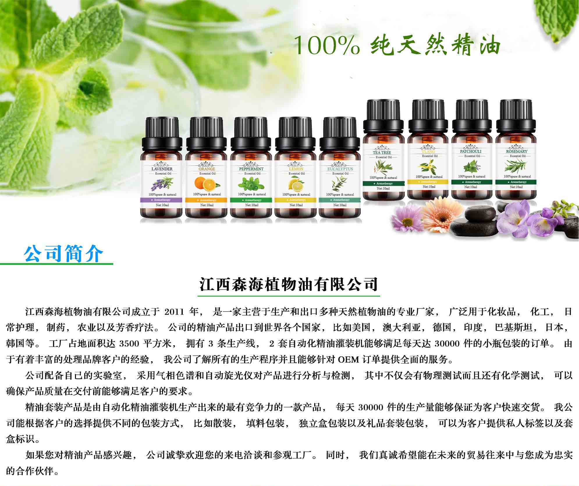 江西森海植物油有限公司成立于2011年,是一家主營于生產(chǎn)和出口多種天然植物油的專業(yè)廠家,廣泛用于化妝品,化工,日常護(hù)理,制藥,農(nóng)業(yè)以及芳香療法。公司的精油產(chǎn)品出口到世界各個國家,比如美國,澳大利亞,德國,印度,巴基斯坦,日本,韓國等。工廠占地面積達(dá)3500平方米,擁有3條生產(chǎn)線,2套自動化精油灌裝機(jī)能夠滿足每天達(dá)30000件的小瓶包裝的訂單。由于有著豐富的處理品牌客戶的經(jīng)驗,我公司了解所有的生產(chǎn)程序并且能夠針對OEM訂單提供全面的服務(wù)。
