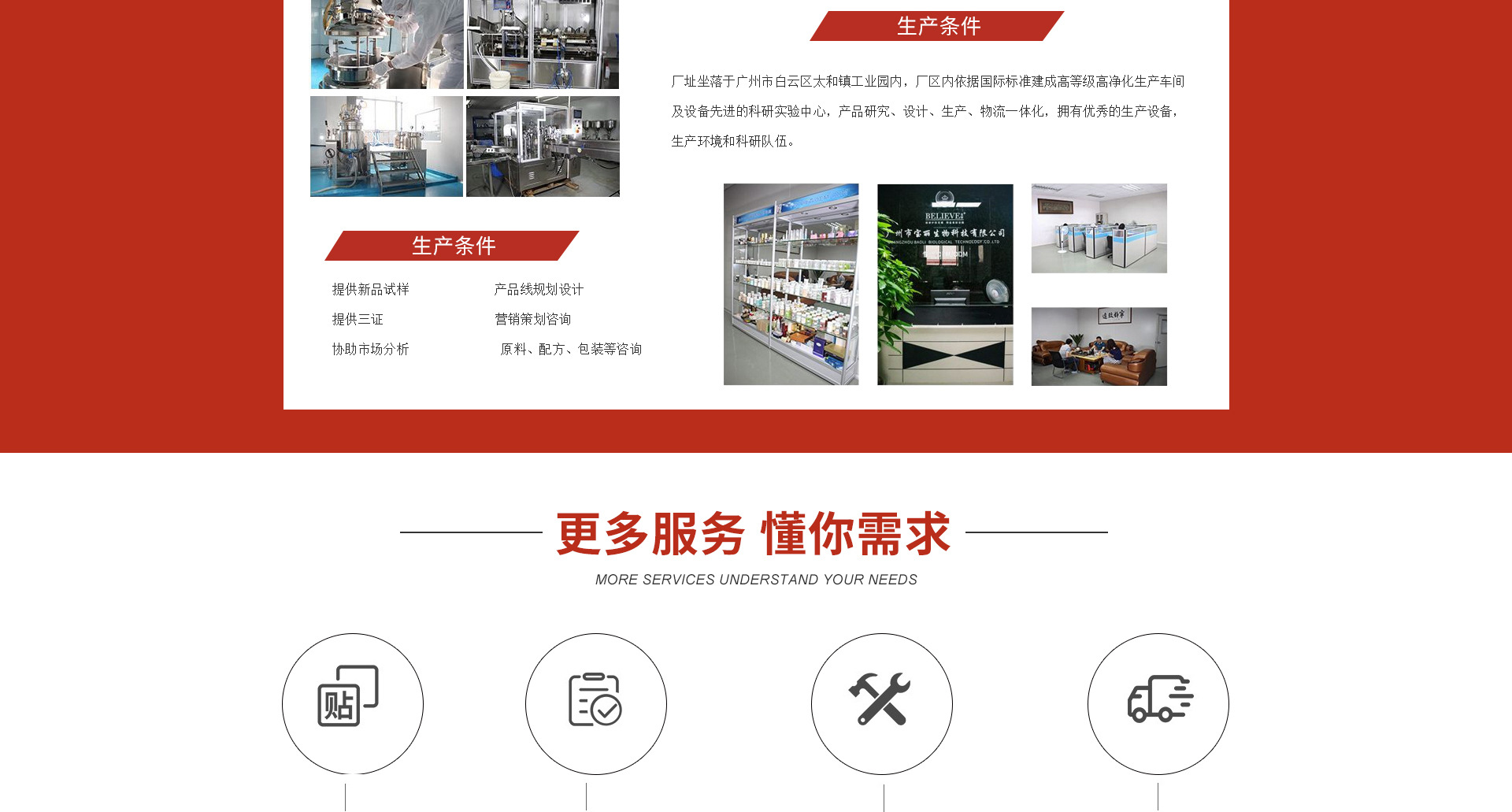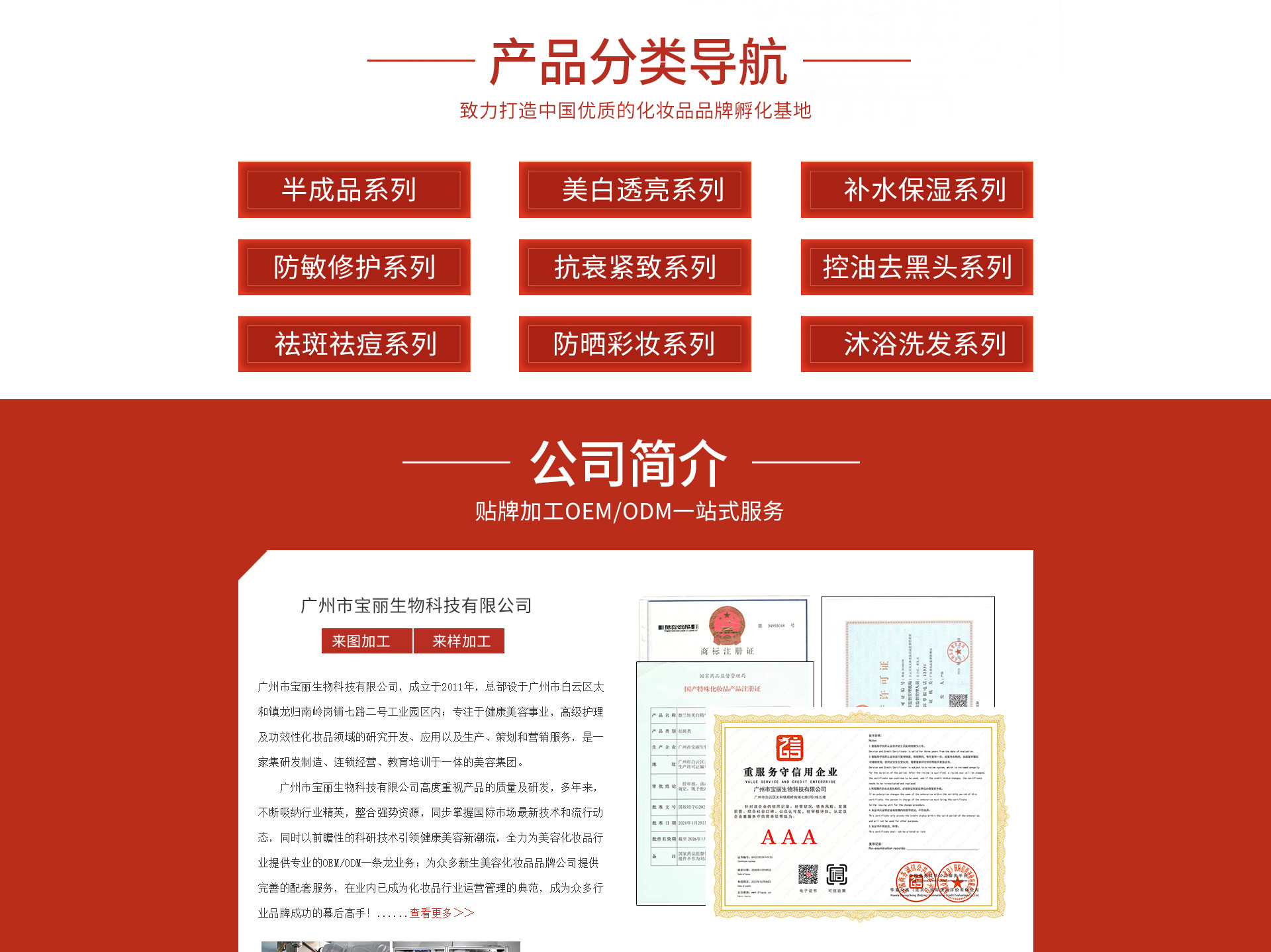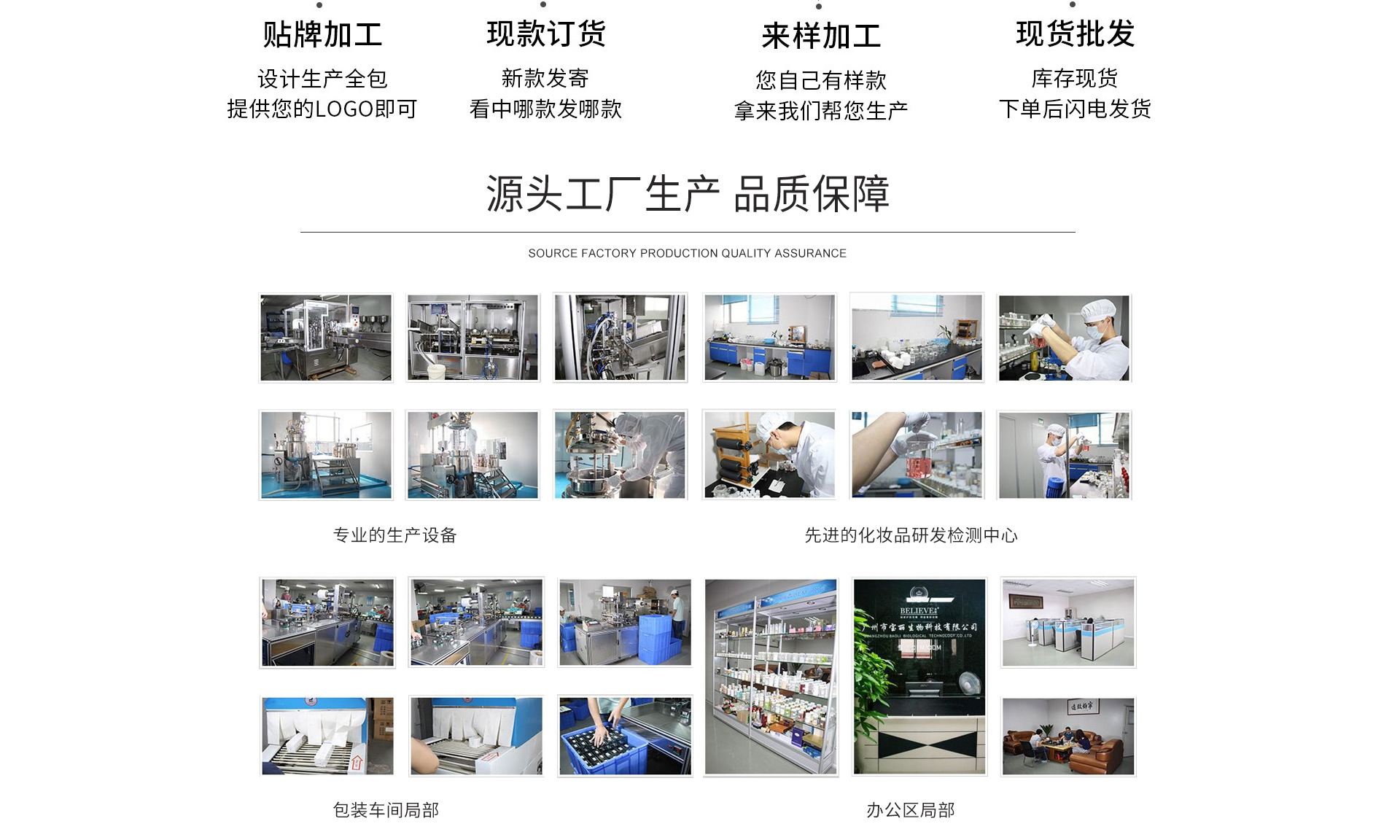 廣州市寶麗生物科技有限公司,成立于2011年,總部設于廣州市白云區太和鎮龍歸南嶺崗鋪七路二號工業園區內;專注于健康美容事業,高級護理及功效性化妝品領域的研究開發、應用以及生產、策劃和營銷服務,是一家集研發制造、連鎖經營、教育培訓于一體的美容集團。 廣州市寶麗生物科技有限公司高度重視產品的質量及研發,多年來,不斷吸納行業精英,整合強勢資源,同步掌握國際市場最新技術和流行動態,同時以前瞻性的科研技術引領健康美容新潮流,全力為美容化妝品行業提供專業的OEM/ODM一條龍業務;為眾多新生美容化妝品品牌公司提供完善的配套服務,在業內已成為化妝品行業運營管理的典范,成為眾多行業品牌成功的幕后高手! 2013年,廣州市寶麗生物科技有限公司投入巨資建成了標準式的化妝品廠房,并特聘行業資深管理及技術人員負責運作,生產基地擁有環保舒適的現代化生產車間