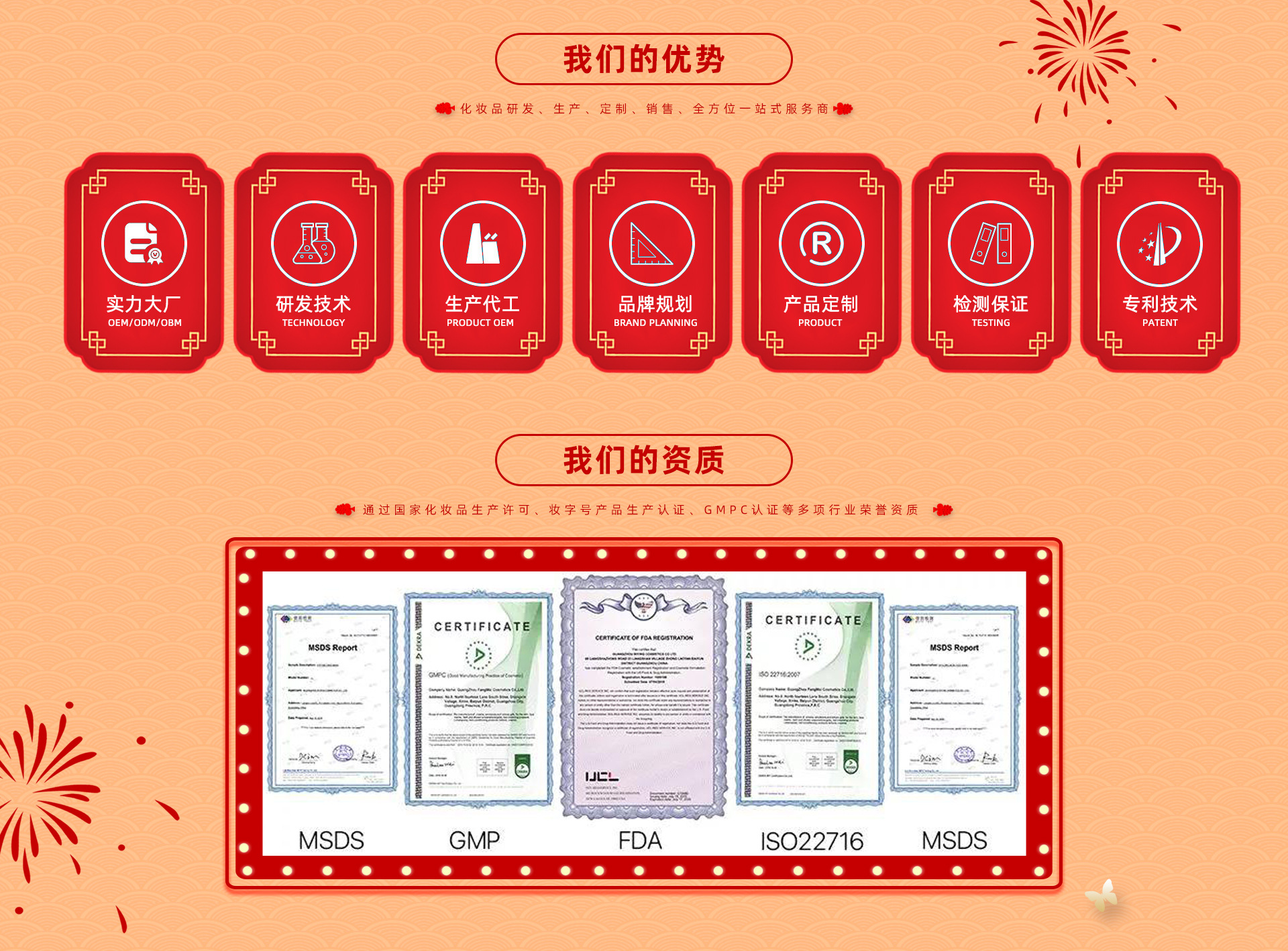 廣州若妝化妝品有限公司是集彩妝、護膚化妝品、化妝品原料、包裝、化妝品批發及零售等產品專業生產加工的公司,擁有完整、科學的質量管理體系。廣州若妝化妝品有限公司的誠信、實力和產品質量獲得業界的認可。歡迎各界朋友蒞臨參觀、指導和業務洽談。