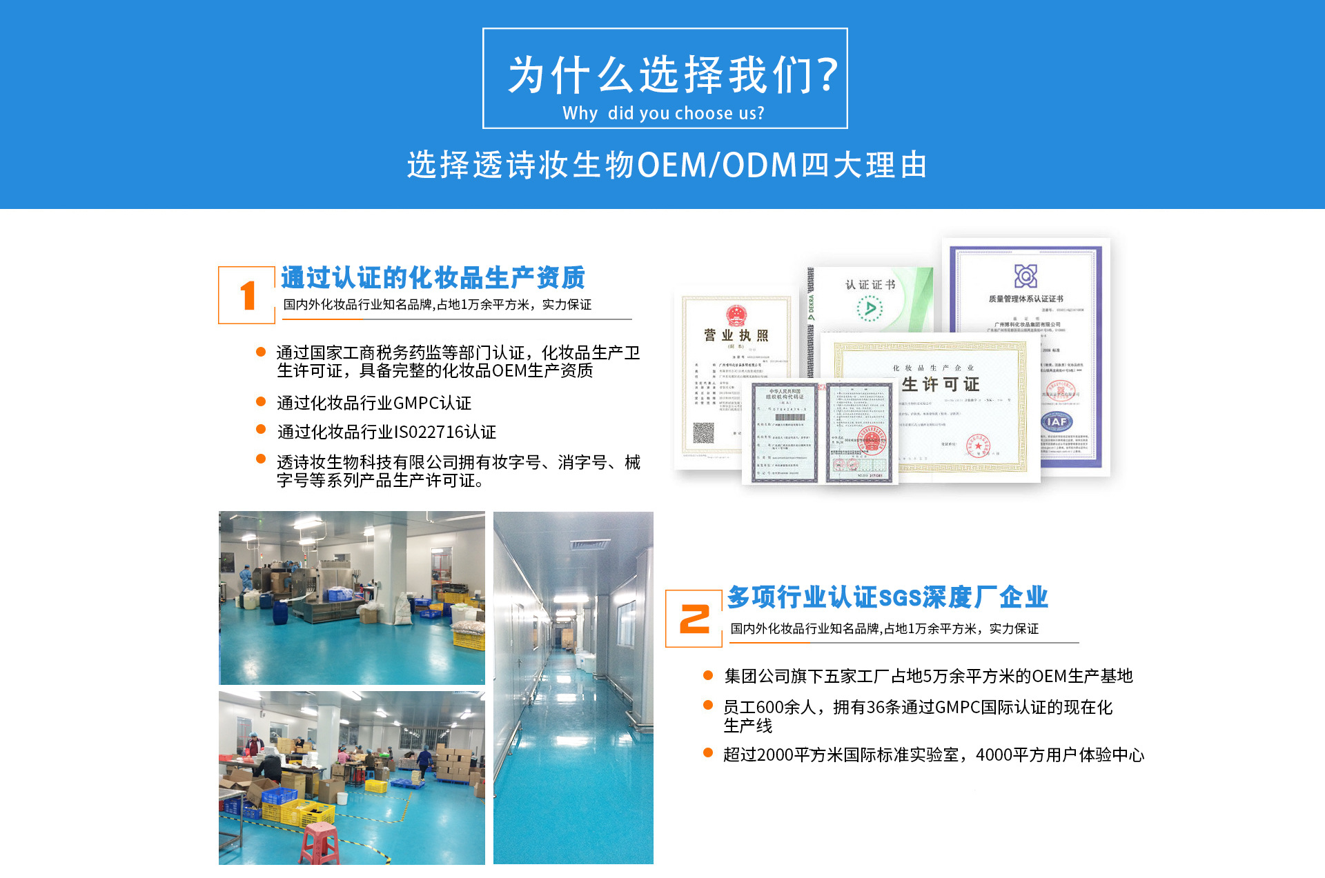 廣州透詩妝生物科技有限公司專業批發/加工貼牌/代工 原液、凍干粉、晶粉、塑形粉、安瓶精華、洗面奶、專業線面膜、臺灣軟膠囊、定妝素、粉底、精油、醫美皮膚管理專用,眼部組套裝等產品,專業OEM貼牌加工,歡迎親們電話咨詢下單。擁有完整、科學的質量管理體系。廣州透詩妝生物科技有限公司的誠信、實力和產品質量獲得業界的認可。歡迎各界朋友蒞臨參觀、指導和業務洽談