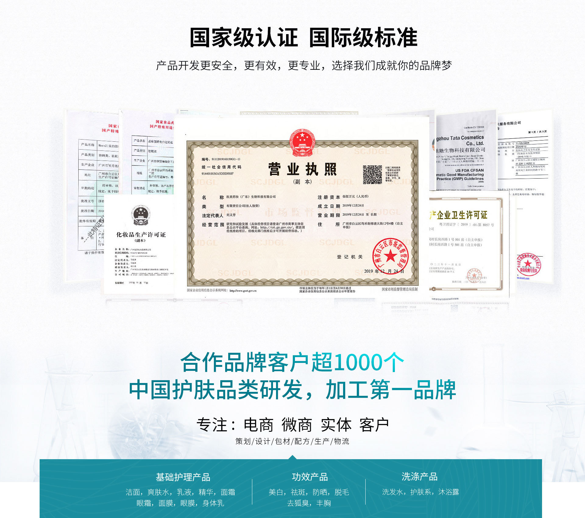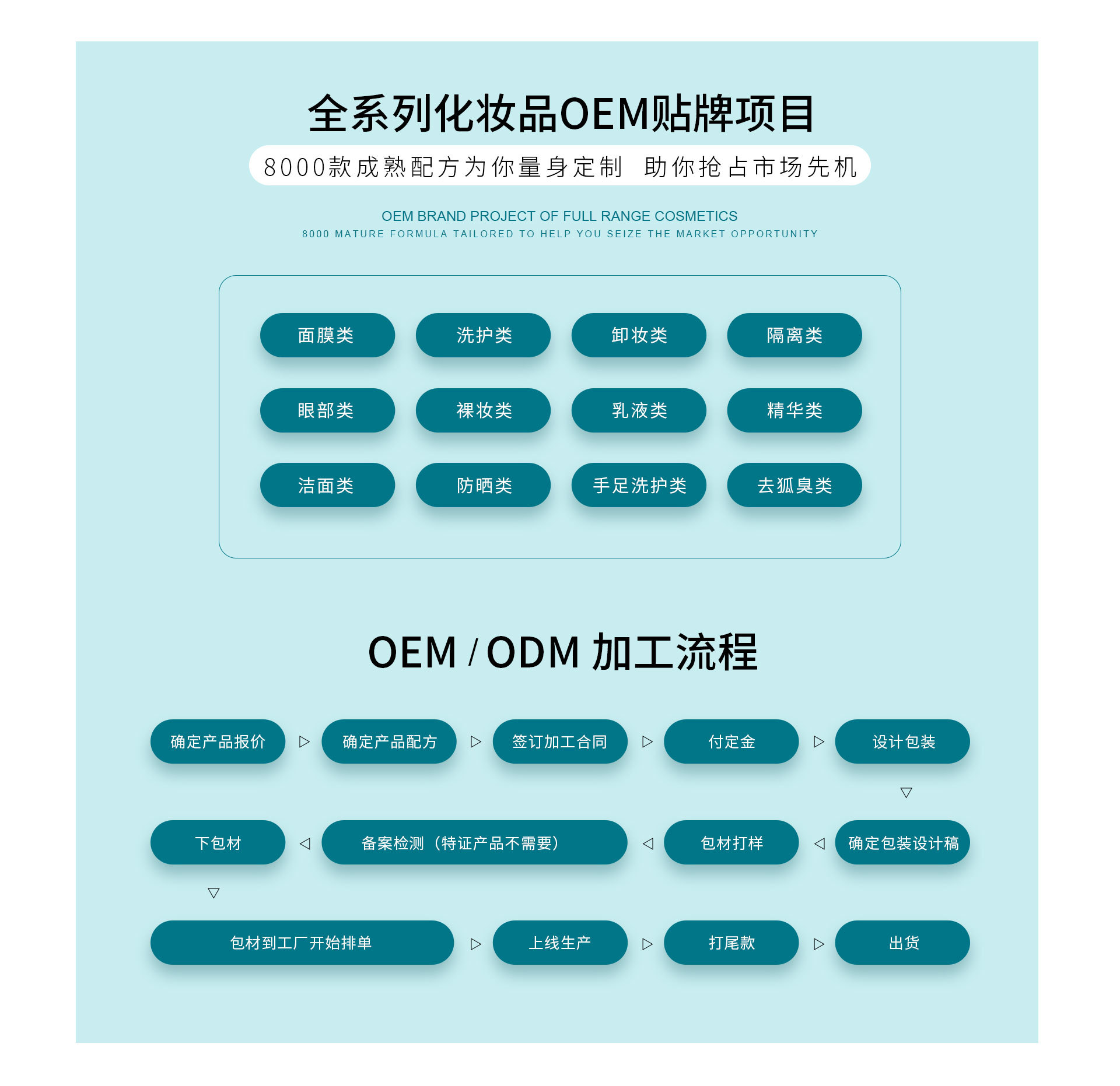 旗下有2家天貓旗艦店,1家京東自營店,自有工廠,集生產、研發、銷售于一體,支持一件代發,平均發貨時長不超過24小時,庫存充足投產速度快。支持化妝品OEM貼牌代加工