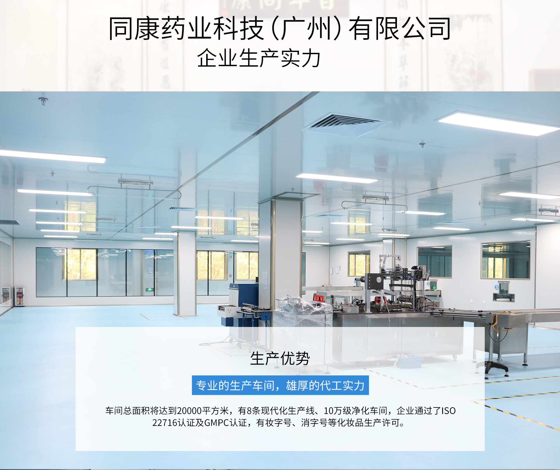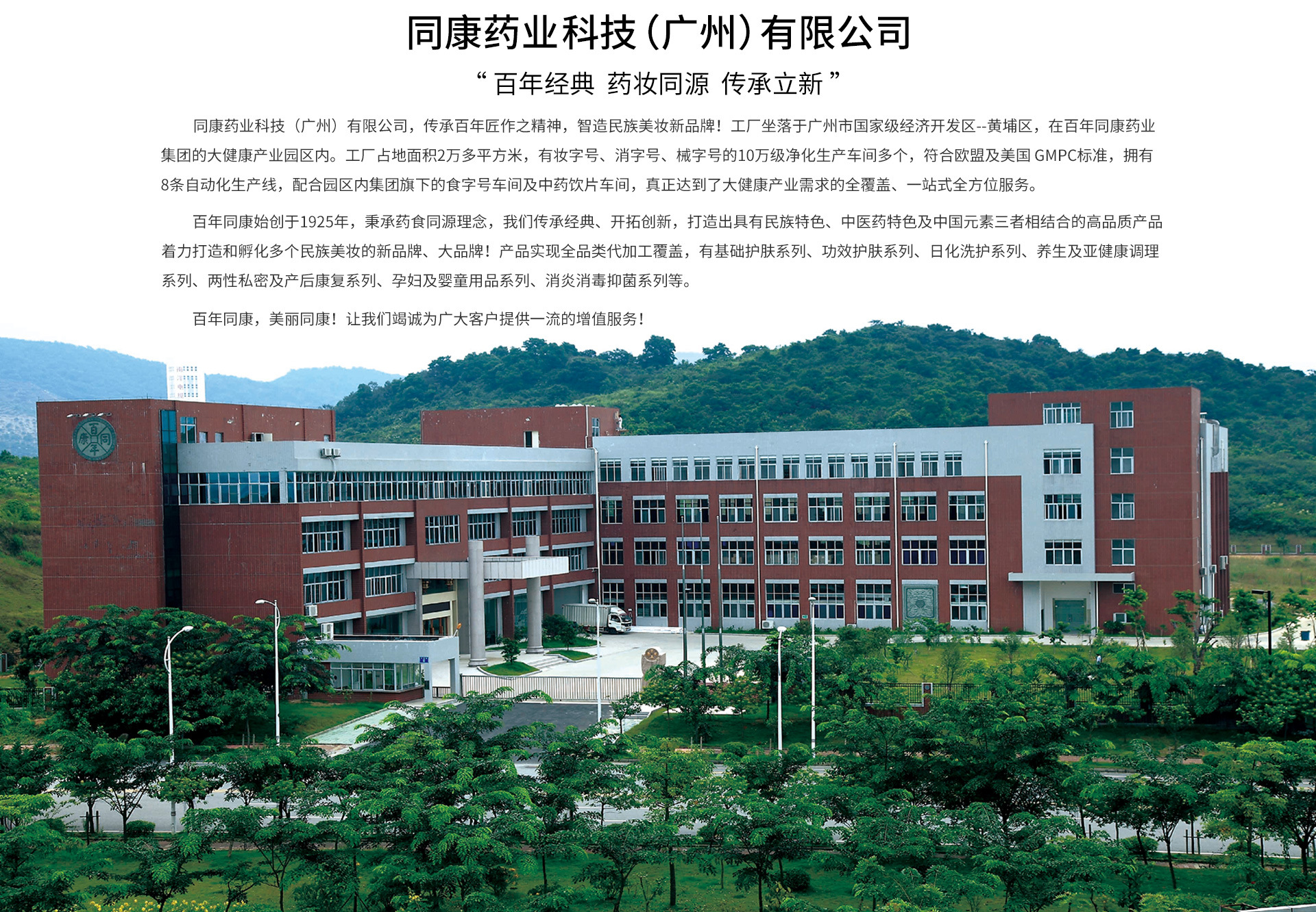 同康藥業科技(廣州)有限公司,傳承百年匠作之精神,智造民族美妝新品牌!工廠坐落于廣州市國家級經濟開發區--黃埔區,在百年同康藥業集團的大健康產業園區內。工廠占地面積2萬多平方米,有妝字號、消字號、械字號的10萬級凈化生產車間多個,符合歐盟及美國 GMPC標準,擁有8條自動化生產線,配合園區內集團旗下的食字號車間及中藥飲片車間,真正達到了大健康產業需求的全覆蓋、一站式全方位服務。百年同康始創于1925年,秉承藥食同源理念,我們傳承經典、開拓創新,打造出具有民族特色、中醫藥特色及中國元素三者相結合的高品質產品,著力打造和孵化多個民族美妝的新品牌、大品牌!產品實現全品類代加工覆蓋,有基礎護膚系列、功效護膚系列、日化洗護系列、養生及亞健康調理系列、兩性私密及產后康復系列、孕婦及嬰童用品系列、消炎消毒抑菌系列等。百年同康,美麗同康!讓我們竭誠為廣大客戶提供一流的增值服務!