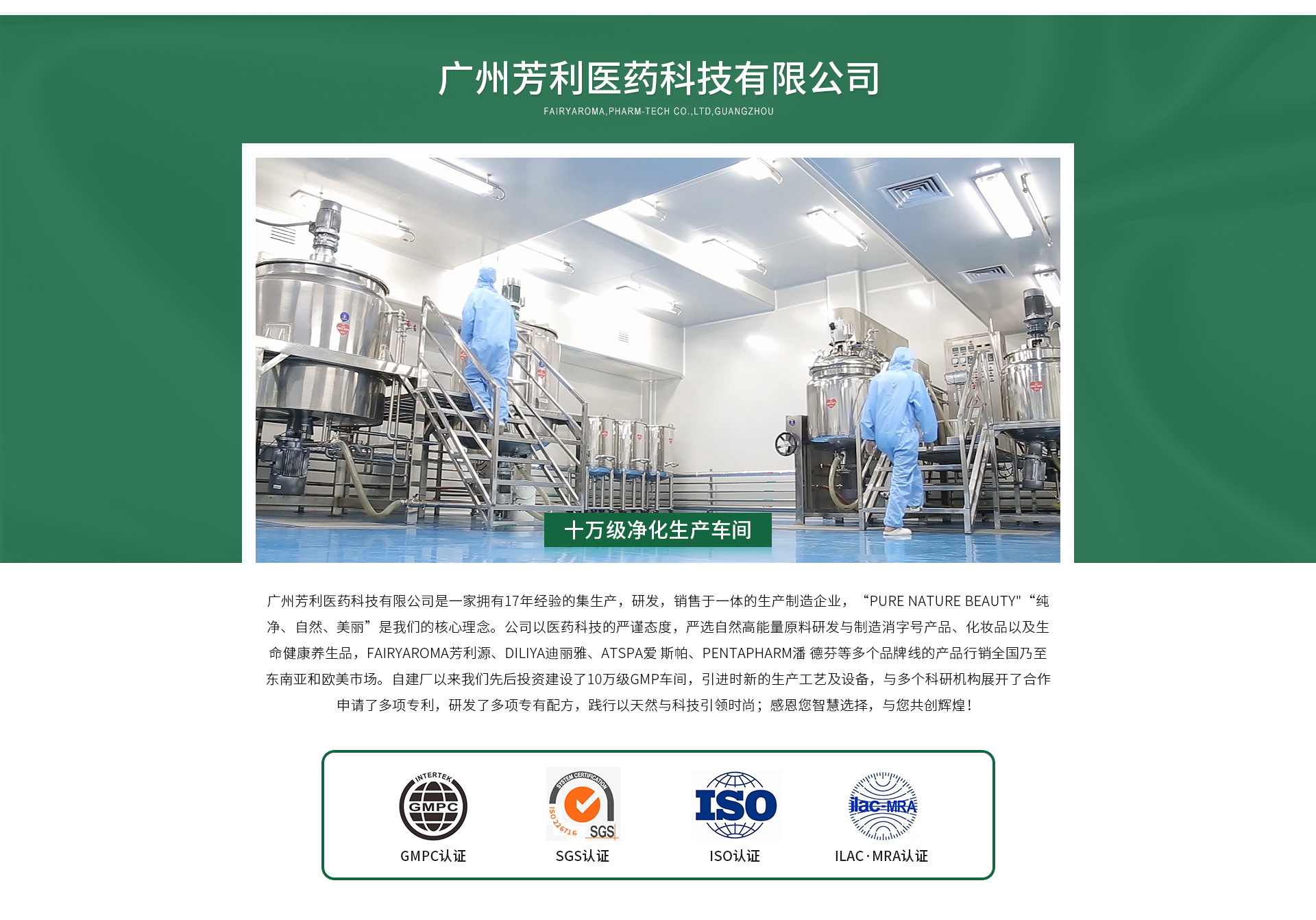 廣州芳利醫藥科技有限公司是一家擁有17年經驗的集生產,研發,銷售于一體的生產制造企業,“PURE NATURE BEAUTY”“純凈、自然、美麗”是我們的核心理念。公司以醫藥科技的嚴謹態度,優選天然高能量原料研發與制造消字號產品、化妝品以及生命健康養生品,FairyAroma芳利源、Diliya迪麗雅、Atspa愛斯帕、PENTAPHARM潘德芬等多個品牌線的產品行銷全國乃至東南亞和歐美市場。 自建廠以來我們先后投資建設了10萬級GMP車間,引進時新的生產工藝及設備,與多個科研機構展開了合作,申請了多項專利,研發了多項專有配方,踐行以天然與科技引領時尚;感恩您智慧選擇;與您共創輝煌!