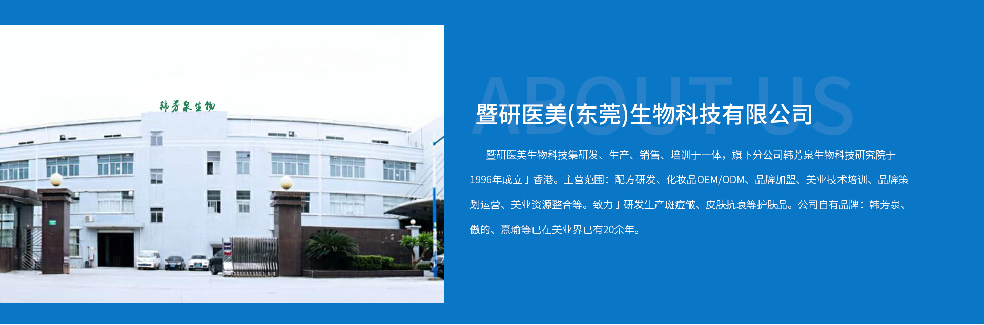 暨研醫(yī)美生物科技集研發(fā)、生產(chǎn)、銷售、培訓(xùn)于一體,旗下分公司韓芳泉生物科技研究院于1996年成立于香港。主營范圍:配方研發(fā)、化妝品OEM/ODM、品牌加盟、美業(yè)技術(shù)培訓(xùn)、品牌策劃運(yùn)營、美業(yè)資源整合等。致力于研發(fā)生產(chǎn)斑痘皺、皮膚抗衰等高端護(hù)膚品,打造比醫(yī)療美容更安全,比生活美容更有效的“便攜式口袋美容院”。公司自有品牌:韓芳泉、傲的、熹瑜等已在美業(yè)界已有20余年的知名度。