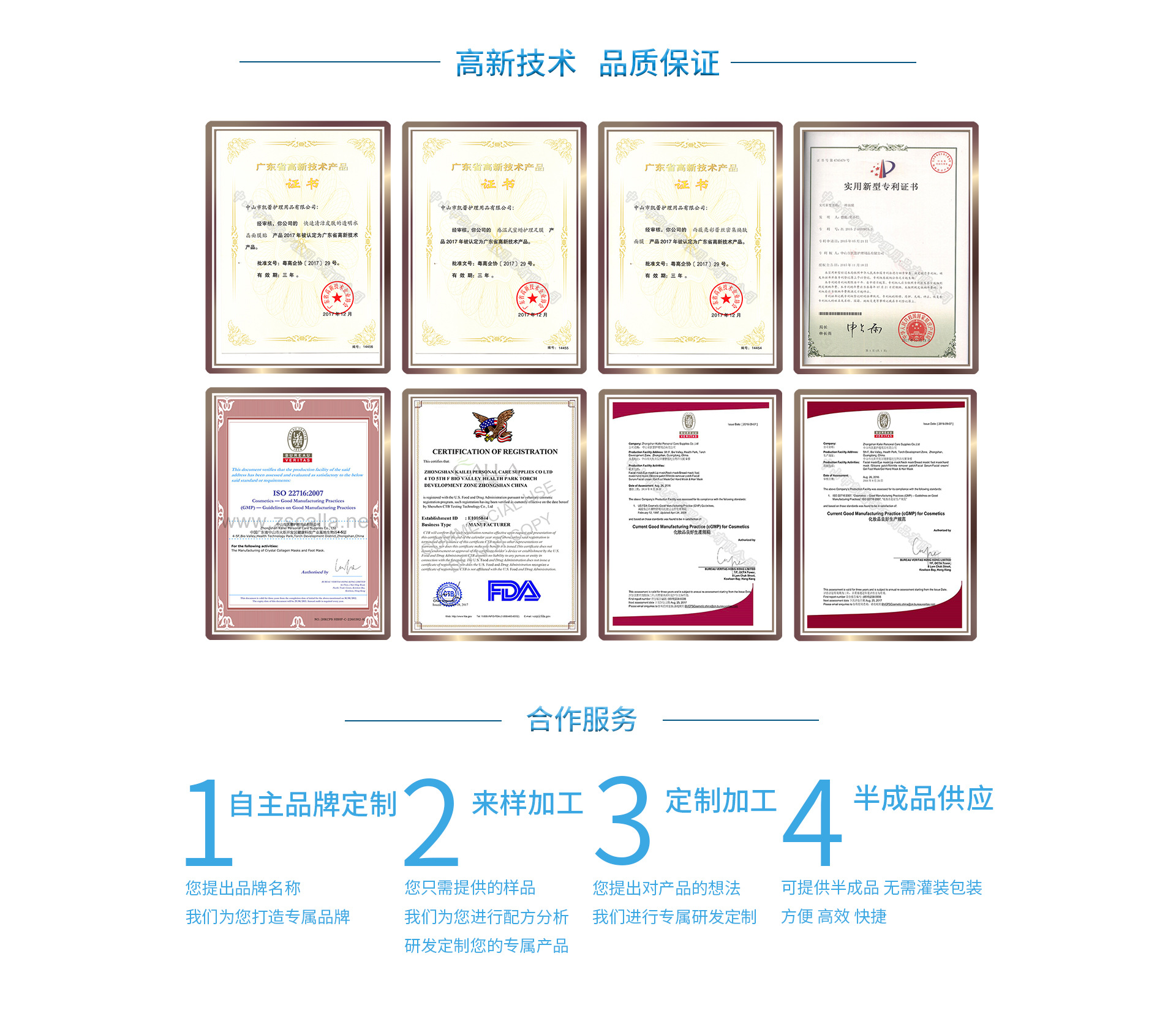 中山市凱蕾護理用品有限公司成立于2007年,位于南朗鎮華南現代中醫藥城,是一家致力于護膚、消毒,防護、創傷病變護理用品研發與生產的科技型企業。同時也是惠譽生物醫學研究院博士工作站、中山市應用化學研究所及再生醫學轉化研究中心的定點合作單位,于2017年被評定為廣東省高新技術企業。在雄厚的科研團隊帶領下,我們擁有多項專利,這十幾年來與國、內外眾多知名品牌進行了深入的OEM/ODM品牌代工合作。 為擴大產能,2018年從德國購置先進的生產設備,引進韓國技術,打造十萬級GMP無塵生產車間,同時也通過了化妝品行業的國際標準ISO 22716管理體系,擁有BSCI、美國FDA、GMPC、CPSR、SGS等國際認證 。