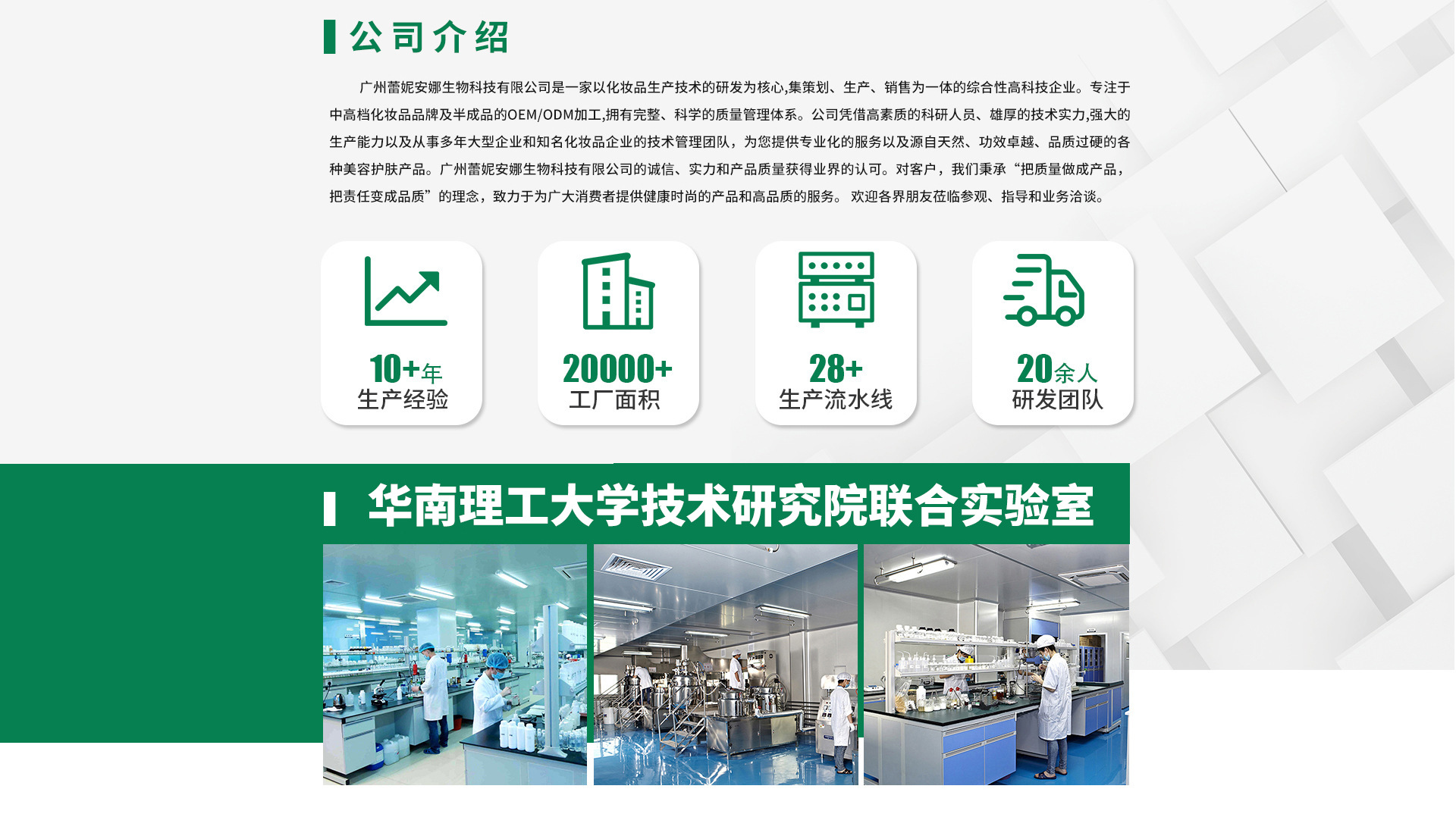 廣州蕾妮安娜生物科技有限公司是嚴(yán)格按照GMPC和ISO22716標(biāo)準(zhǔn)建立的化妝品生產(chǎn)基地,采用先進(jìn)的生產(chǎn)技術(shù)和現(xiàn)代化的生產(chǎn)設(shè)備,是一家在化妝品研發(fā)和制造領(lǐng)域具有核心競(jìng)爭(zhēng)力的有限責(zé)任制企業(yè)。公司專注研發(fā)8000多種優(yōu)質(zhì)配方產(chǎn)品體系,涉及面貼膜代加工,精華原液廠家、洗發(fā)代加工、護(hù)發(fā)代加工、清潔泥膜代加工、護(hù)膚品代加工、美容院SPA功效型產(chǎn)品、精油、按摩油等多個(gè)化妝品加工生產(chǎn)領(lǐng)域。按需oem加工化妝品定制。
