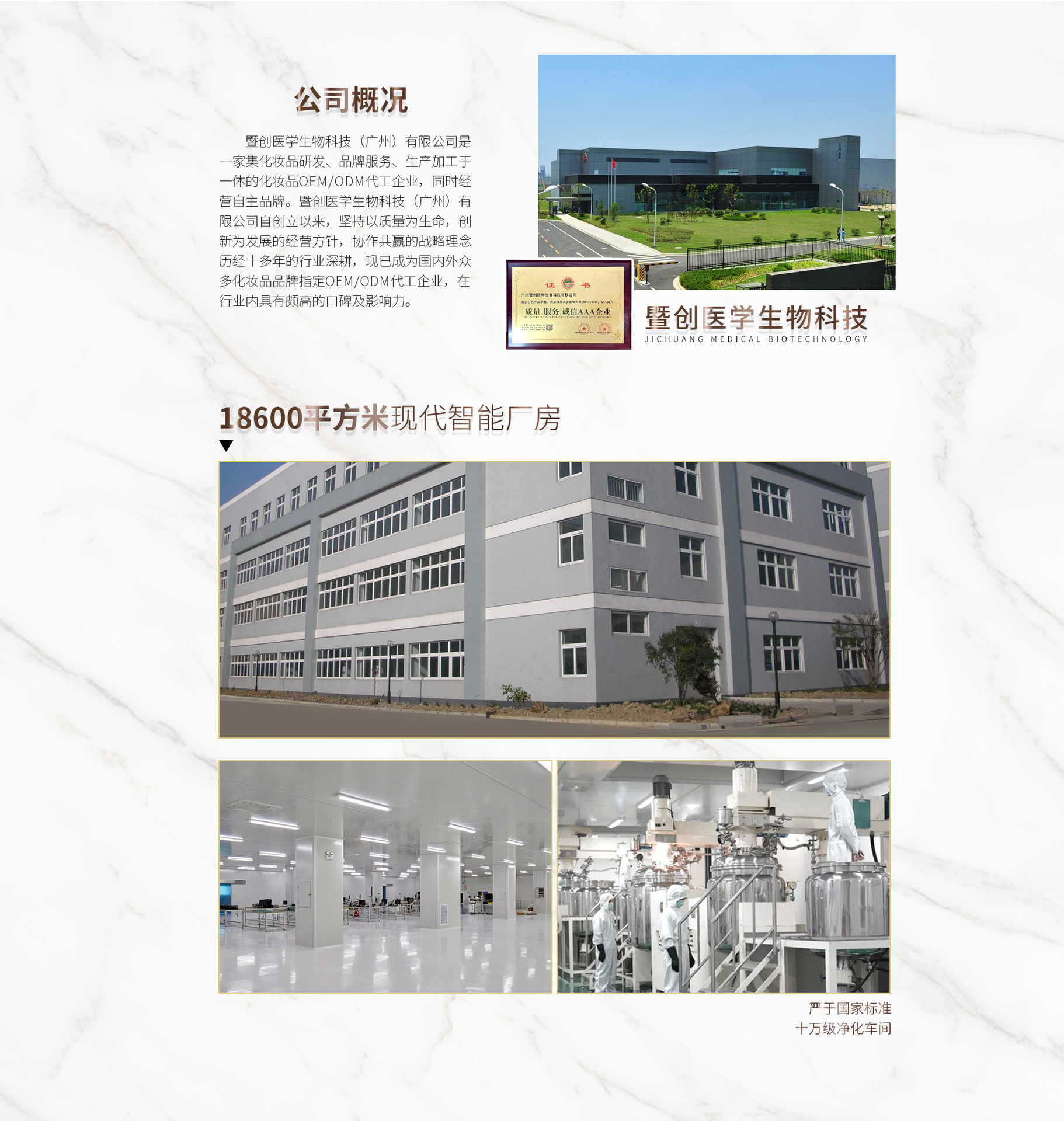 廣州暨創醫學生物科技有限公司是一家集化妝品研發、品牌服務、生產加工于一體的化妝品OEM/ODM代工企業,同時經營自主品牌。廣州暨創醫學生物科技有限公司自創立以來,堅持以質量為生命,創新為發展的經營方針,協作共贏的戰略理念。歷經十多年的行業深耕,現已成為國內外眾多化妝品品牌指定OEM/ODM代工企業,在行業內具有頗高的口碑及影響力。 廣州暨創醫學生物科技有限公司產品線有精華類、面膜類、原液類等,其中人氣產品有寡肽-1凍干粉、寡肽-3凍干粉、藍銅勝肽凍干粉、三型膠原蛋白等等。日均全產能達30萬支。領域已涉及護膚品、日化線、電商、微商線等多種渠道。