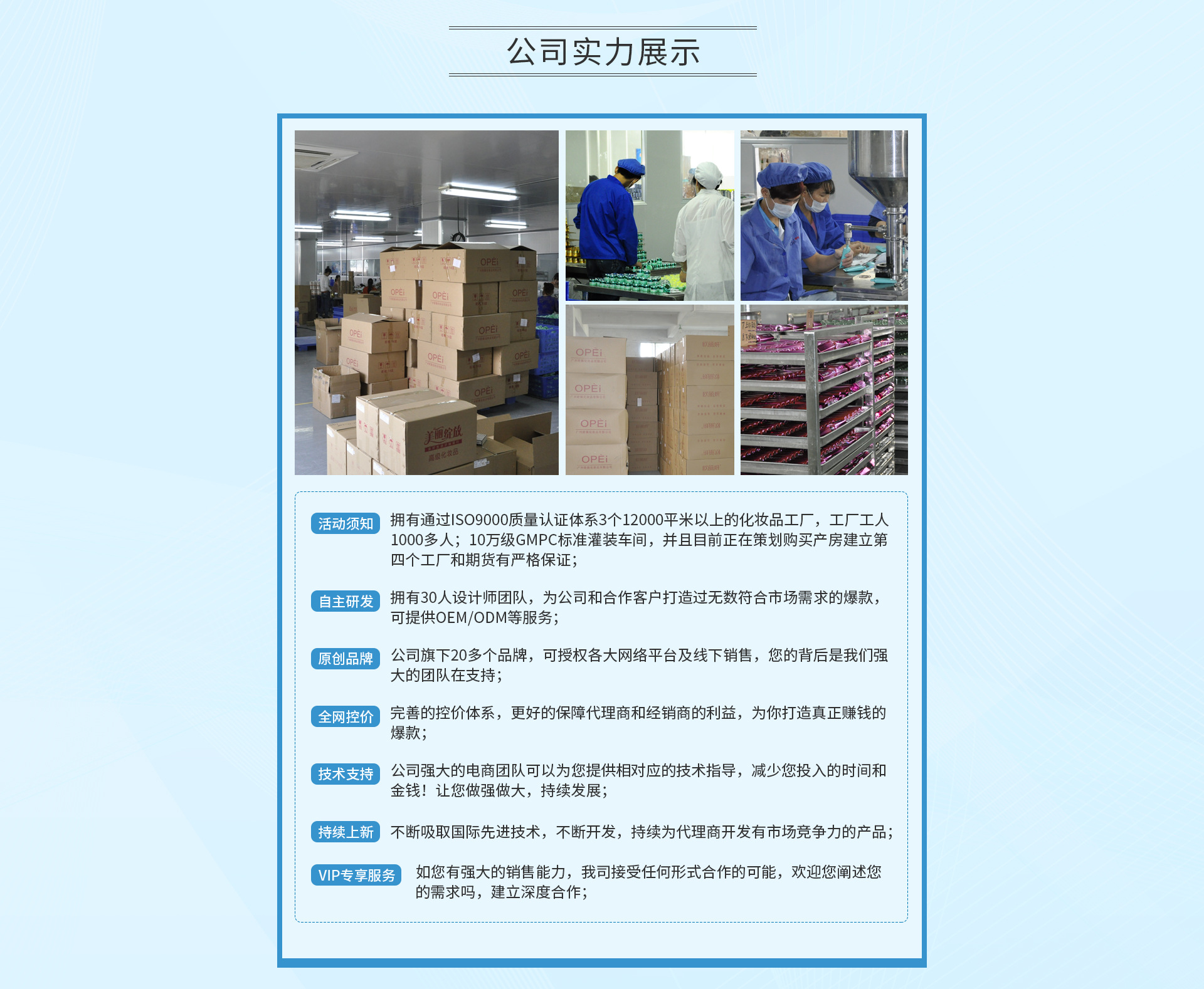 廣州碧瑩集團旗下子公司——廣州市馨美雅化妝品有限公司是集研發、銷售于一體,堅持走品牌發展戰略,秉承誠實守信、質量至上的企業經營理念,是國內有實力的化妝品企業。 公司創辦于1999年,線下18年研發生產銷售經驗。旗下品牌有:“泉美小屋”、碧素堂”、“歐佩”、“植貝”、“冰菊”、“康雪”、“韓佳妮”、“麗芝雅”等等。 公司電商事業部致力于服務各大網絡平臺,實體專柜,線下批發客戶等各渠道。并且與巴黎歐萊雅化妝品國際集團有限公司,韓國玉貴人化妝品國際集團有限公司等國際化著名化妝品企業建立了長期穩定的合作關系,吸取國際先進技術,倡導美容護膚新時尚,不斷開發,推出深受廣大消費者喜愛的產品。