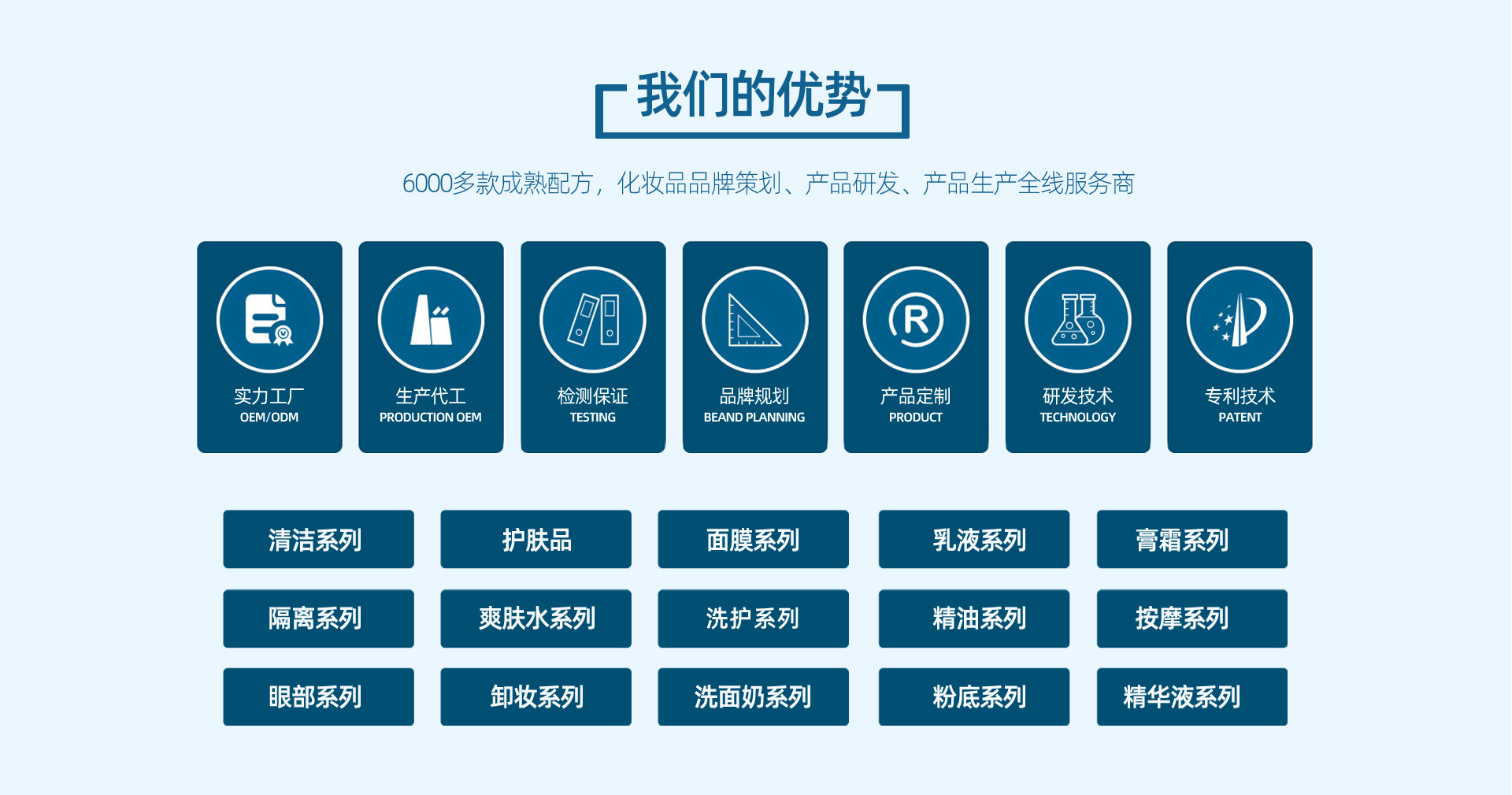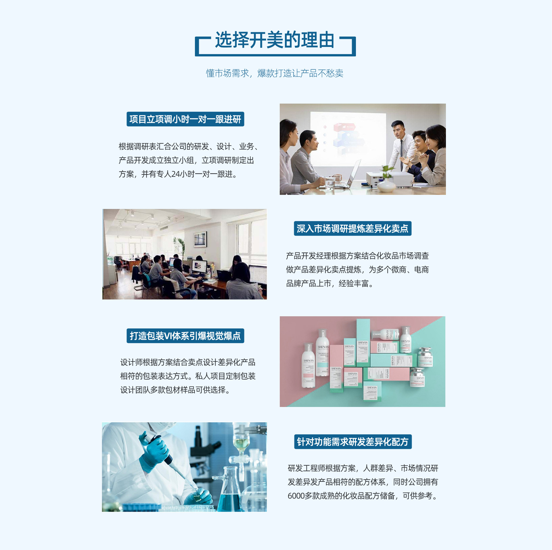 開美化妝品源頭廠家專業(yè)從事化妝品研發(fā)、策劃、生產(chǎn)為一體的集團化妝品企業(yè),專注于中高檔網(wǎng)絡熱銷和功效美容化妝品品牌及半成品OEM/ODM加工,已和國內(nèi)外多家化妝品知名品牌建立合作關系,我們擁有10000平方的正規(guī)化生產(chǎn)基地,有十幾年與大型知名化妝品企業(yè)合作經(jīng)驗的優(yōu)秀技術管理團隊,為你提供專業(yè)化的優(yōu)質(zhì)產(chǎn)品、優(yōu)質(zhì)服務。 公司十幾年來一直致力化妝品研究和推廣,擁有北大、中大、第四軍醫(yī)大專家組成的顧問團隊,資深質(zhì)量管理工程師專職保證產(chǎn)品質(zhì)量。秉承“三好一合理”(品質(zhì)好、信用好、服務好、價格合理)的經(jīng)營理念和“與時俱進,開拓創(chuàng)新”的企業(yè)文化,不斷開啟高品質(zhì)、國際化的多緯度的服務新篇章。 開美始終堅持“品質(zhì)決定再次消費”的原則,嚴把質(zhì)量關,確保產(chǎn)品質(zhì)量。面對日益劇烈的市場競爭,我們有實力讓您安心、讓您放心消費本公司產(chǎn)品,讓您真正體會到名牌產(chǎn)品的實惠和質(zhì)量的保證。