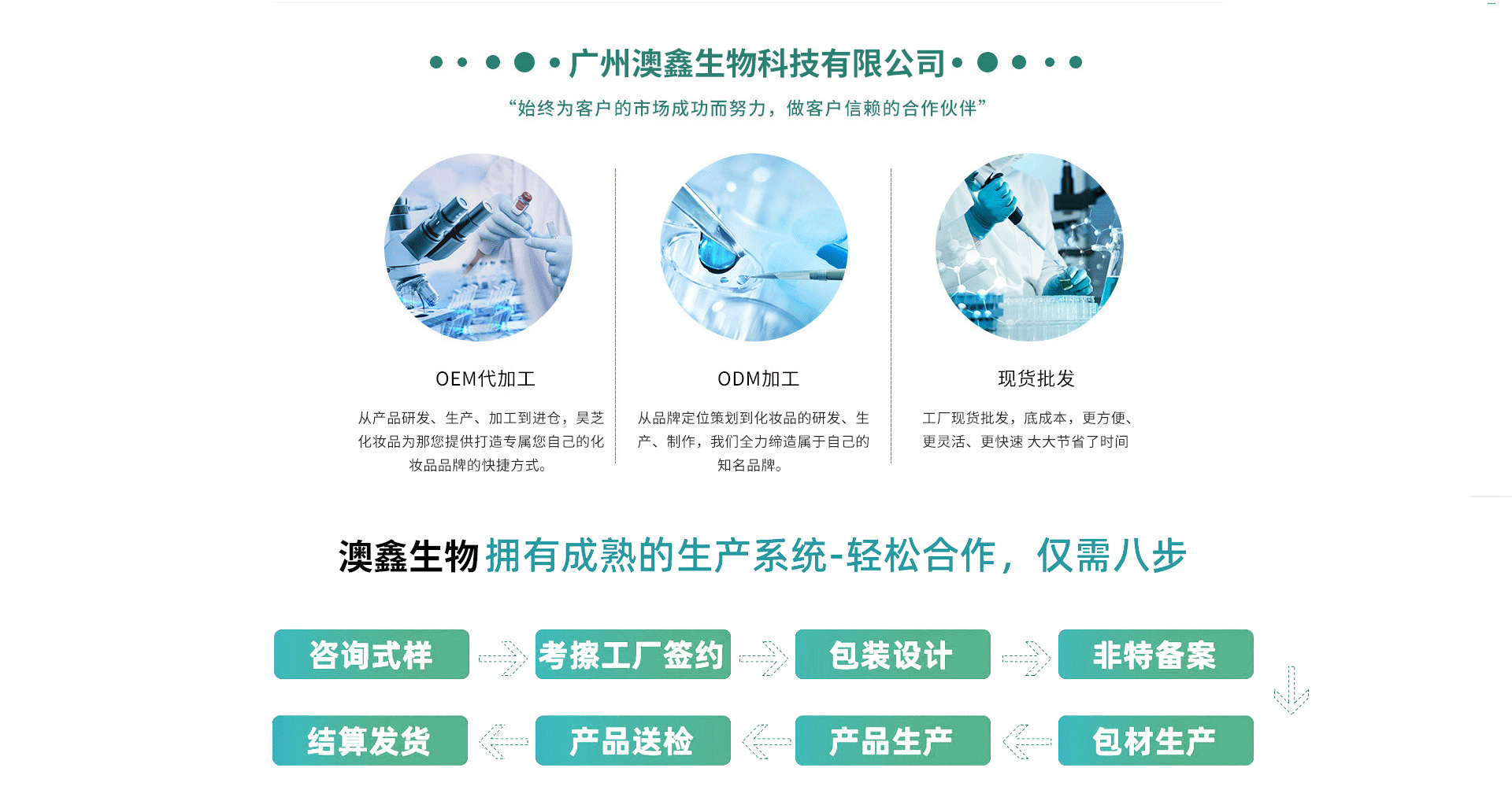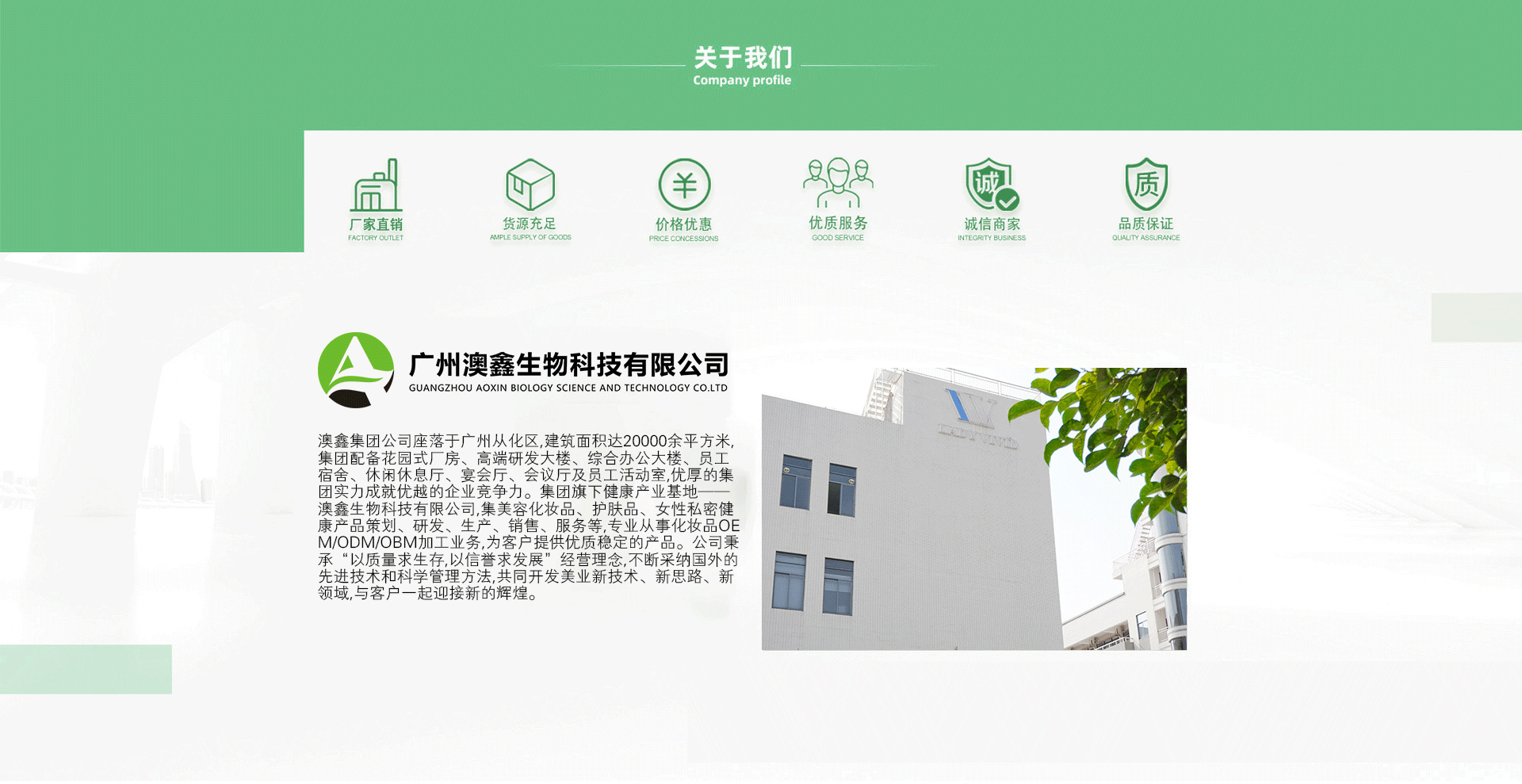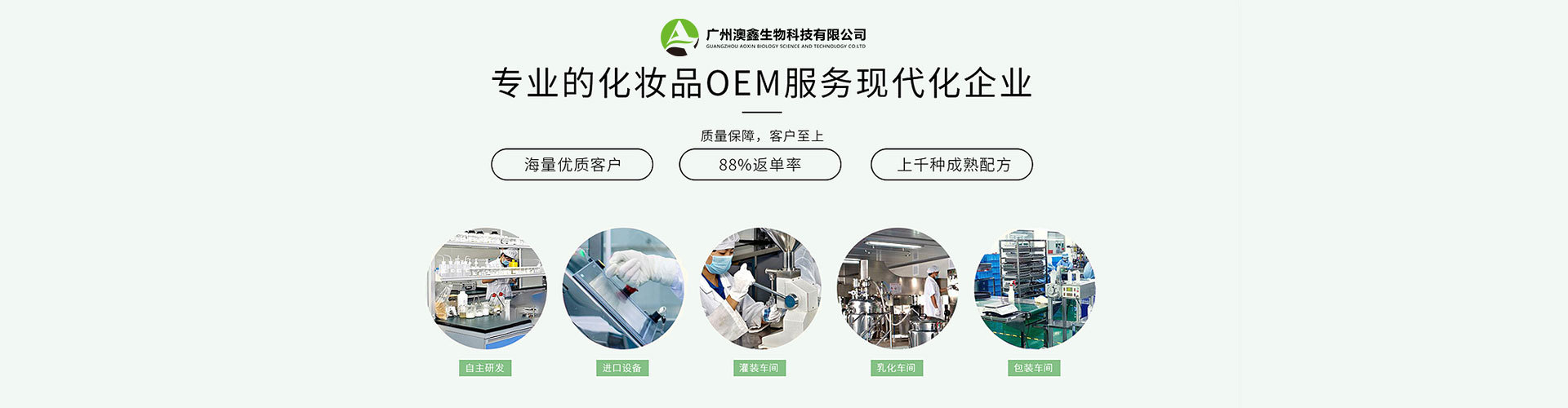 廣州澳鑫生物科技有限公司,工廠座落于廣州從化區,建筑面積達30000余平方米,集團配備花園式廠房、高端研發大樓、綜合辦公大樓、員工宿舍、休閑休息廳、宴會廳、會議廳及員工活動室,優厚的集團實力成就優越的企業競爭力。 集團旗下健康產業基地——澳鑫生物科技有限公司,集美容化妝品、護膚品、女性私密健康產品策劃、研發、生產、銷售、服務等,專業從事化妝品OEM/ODM/OBM加工業務。生產基地有十一條高標準備、高規格現代化生產流水線及國內最大消字號生產車間,為客戶提供優質穩定的產品。 公司秉承“以質量求生存,以信譽求發展”經營理念,不斷采納國外的先進技術和科學管理方法,共同開發美業新技術、新思路、新領域,一步一個臺階,與客戶一起迎接新的輝煌。為客戶提供化妝品OEM/ODM/OBM等一站式服務大型化妝品加工廠家!
