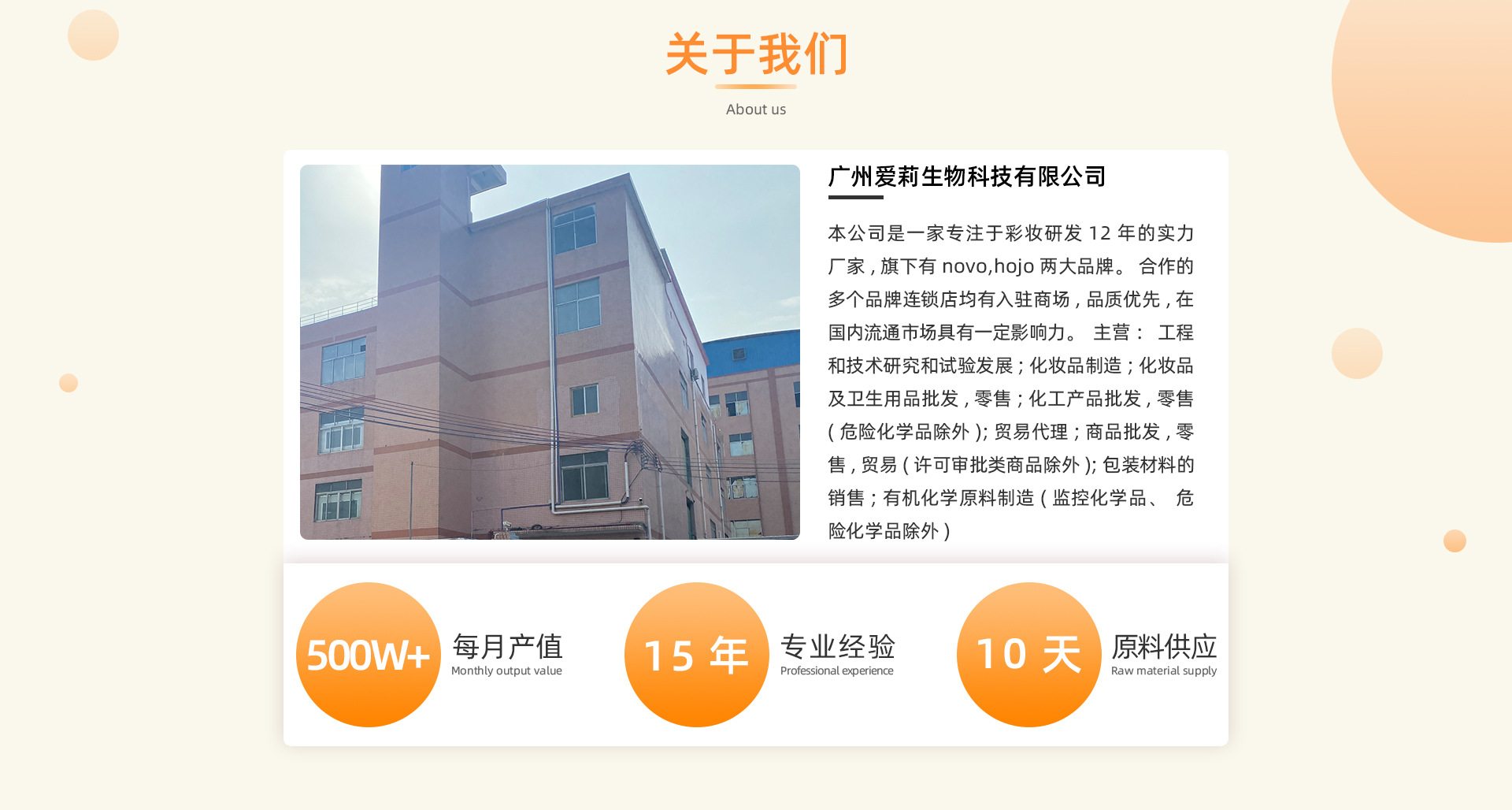 廣州愛莉生物科技有限公司是一家專注于彩妝研發12年的實力廠家,旗下有novo,hojo兩大品牌。 合作的多個品牌連鎖店均有入駐商場,品質優先,在國內流通市場具有一定影響力。