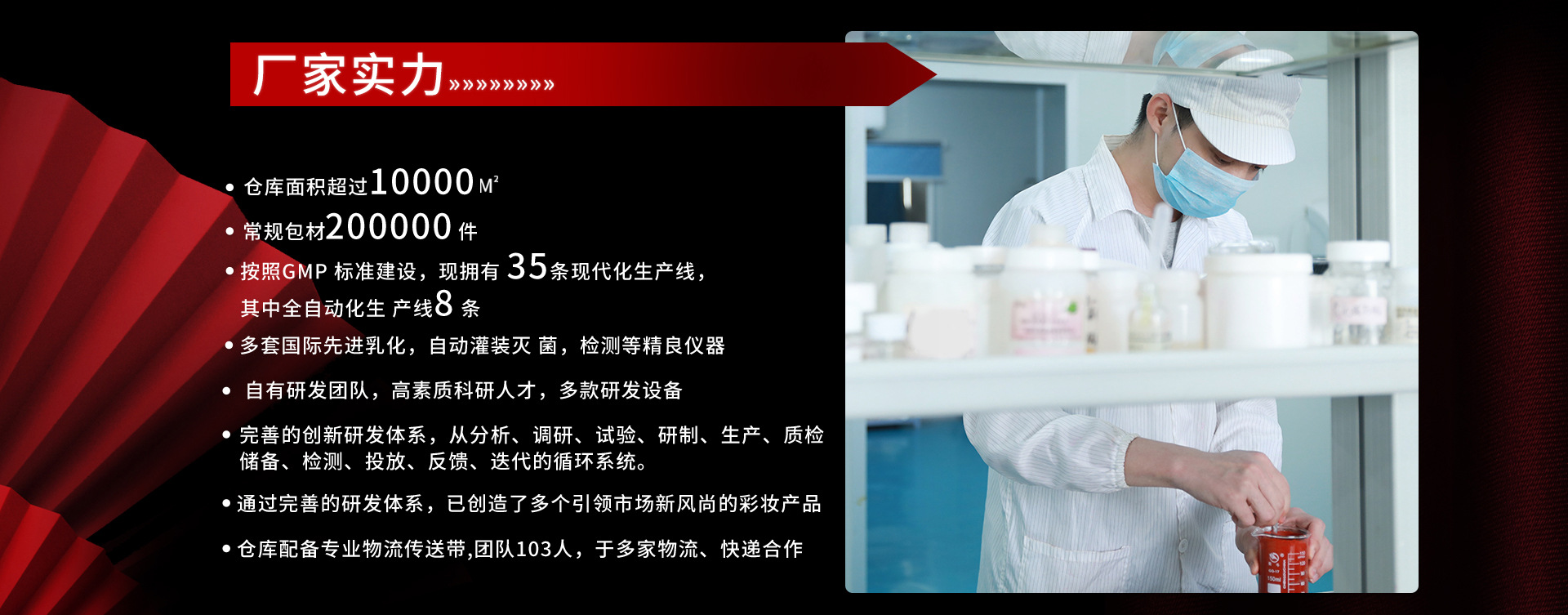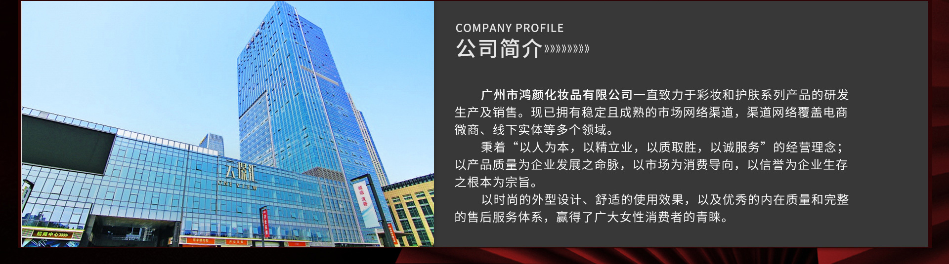 廣州鴻顏化妝品有限公司是口紅/唇膏、唇釉/唇彩、眉筆/眉粉/眉膏、氣墊BB霜、眼影、粉底液/粉底膏、睫毛膏、眼線筆/眼線液、遮瑕筆/遮瑕膏、胭脂/腮紅等產品專業生產加工的公司,擁有完整、科學的質量管理體系。廣州鴻顏化妝品有限公司的誠信、實力和產品質量獲得業界的認可。歡迎各界朋友蒞臨參觀、指導和業務洽談。