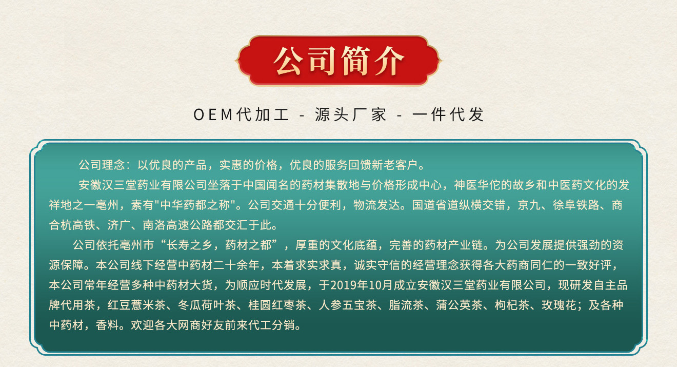 安徽漢三堂藥業(yè)有限公司坐落于中國聞名的藥材集散地與價(jià)格形成中心,神醫(yī)華佗的故鄉(xiāng)和中醫(yī)藥文化的發(fā)祥地之一亳州,素有"中華藥都之稱"。公司交通十分便利,物流發(fā)達(dá)。國道省道縱橫交錯,京九、徐阜鐵路、商合杭高鐵、濟(jì)廣、南洛高速公路都交匯于此。 公司依托亳州市”長壽之鄉(xiāng),藥材之都”,厚重的文化底蘊(yùn),完善的藥材產(chǎn)業(yè)鏈。為公司發(fā)展提供強(qiáng)勁的資源保障。本公司線下經(jīng)營中藥材二十余年,本著求實(shí)求真,誠實(shí)守信的經(jīng)營理念獲得各大藥商同仁的一致好評,本公司常年經(jīng)營多種中藥材大貨,為順應(yīng)時代發(fā)展,于2019年10月成立安徽漢三堂藥業(yè)有限公司,現(xiàn)研發(fā)自主品牌代用茶,紅豆薏米茶、冬瓜荷葉茶、桂圓紅棗茶、人參五寶茶、脂流茶、蒲公英茶、枸杞茶、玫瑰花;及各種中藥材,香料。歡迎各大網(wǎng)商好友前來代工分銷
