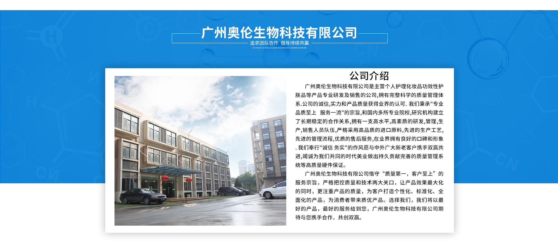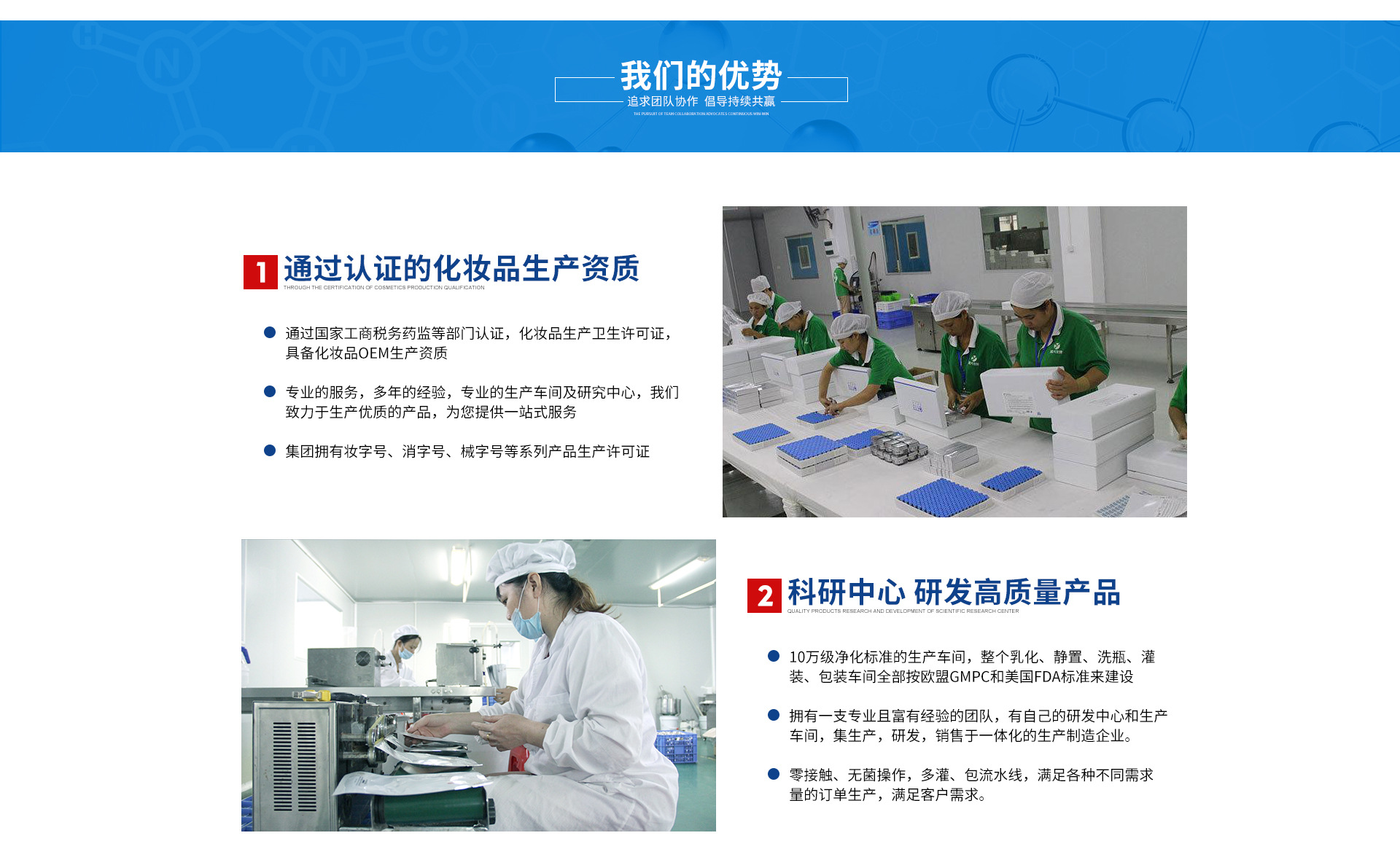 本公司是主營個人護理化妝品功效性護膚品等產(chǎn)品專業(yè)研發(fā)及銷售的公司,擁有完整科學(xué)的質(zhì)量管理體系.公司的誠信,實力和產(chǎn)品質(zhì)量獲得業(yè)界的認(rèn)可. 我們秉承"專業(yè) 品質(zhì)至上 服務(wù)一流"的宗旨,和國內(nèi)多所專業(yè)院校,研究機構(gòu)建立了長期穩(wěn)定的合作關(guān)系,擁有一支高水平,高素質(zhì)的研發(fā),管理,生產(chǎn),銷售人員隊伍,嚴(yán)格采用高品質(zhì)的進口原料,先進的生產(chǎn)工藝,先進的管理流程,優(yōu)質(zhì)的售后服務(wù),在業(yè)界擁有良好的口碑和形象. 我們奉行"誠信 務(wù)實"的作風(fēng)愿與中外廣大新老客戶攜手雙贏共進,竭誠為我們共同的時代美業(yè)做出持久貢獻