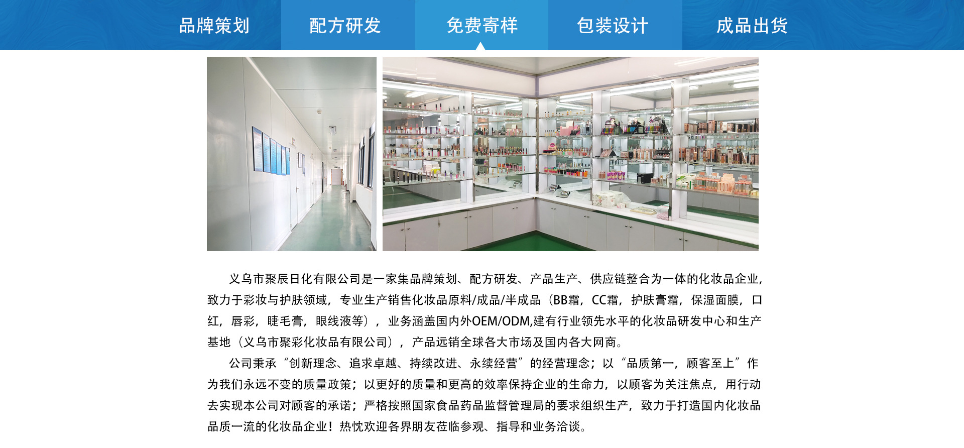 義烏市聚辰日化有限公司是一家集品牌策劃、配方研發(fā)、產(chǎn)品生產(chǎn)、供應(yīng)鏈整合為一體的化妝品企業(yè),致力于彩妝與護(hù)膚領(lǐng)域,專業(yè)生產(chǎn)銷售化妝品原料/成品/半成品(BB霜,CC霜,護(hù)膚膏霜,保濕面膜,口紅,唇彩,睫毛膏,眼線液等),業(yè)務(wù)涵蓋國(guó)內(nèi)外OEM/ODM,建有行業(yè)領(lǐng)先水平的化妝品研發(fā)中心和生產(chǎn)基地(義烏市聚彩化妝品有限公司),產(chǎn)品遠(yuǎn)銷全球各大市場(chǎng)及國(guó)內(nèi)各大網(wǎng)商。 公司秉承“創(chuàng)新理念、追求卓越、持續(xù)改進(jìn)、永續(xù)經(jīng)營(yíng)”的經(jīng)營(yíng)理念;以“品質(zhì)第一,顧客至上”作為我們永遠(yuǎn)不變的質(zhì)量政策;以更好的質(zhì)量和更高的效率保持企業(yè)的生命力,以顧客為關(guān)注焦點(diǎn),用行動(dòng)去實(shí)現(xiàn)本公司對(duì)顧客的承諾;嚴(yán)格按照國(guó)家食品藥品監(jiān)督管理局的要求組織生產(chǎn),致力于打造國(guó)內(nèi)化妝品品質(zhì)一流的化妝品企業(yè)!熱忱歡迎各界朋友蒞臨參觀、指導(dǎo)和業(yè)務(wù)洽談。