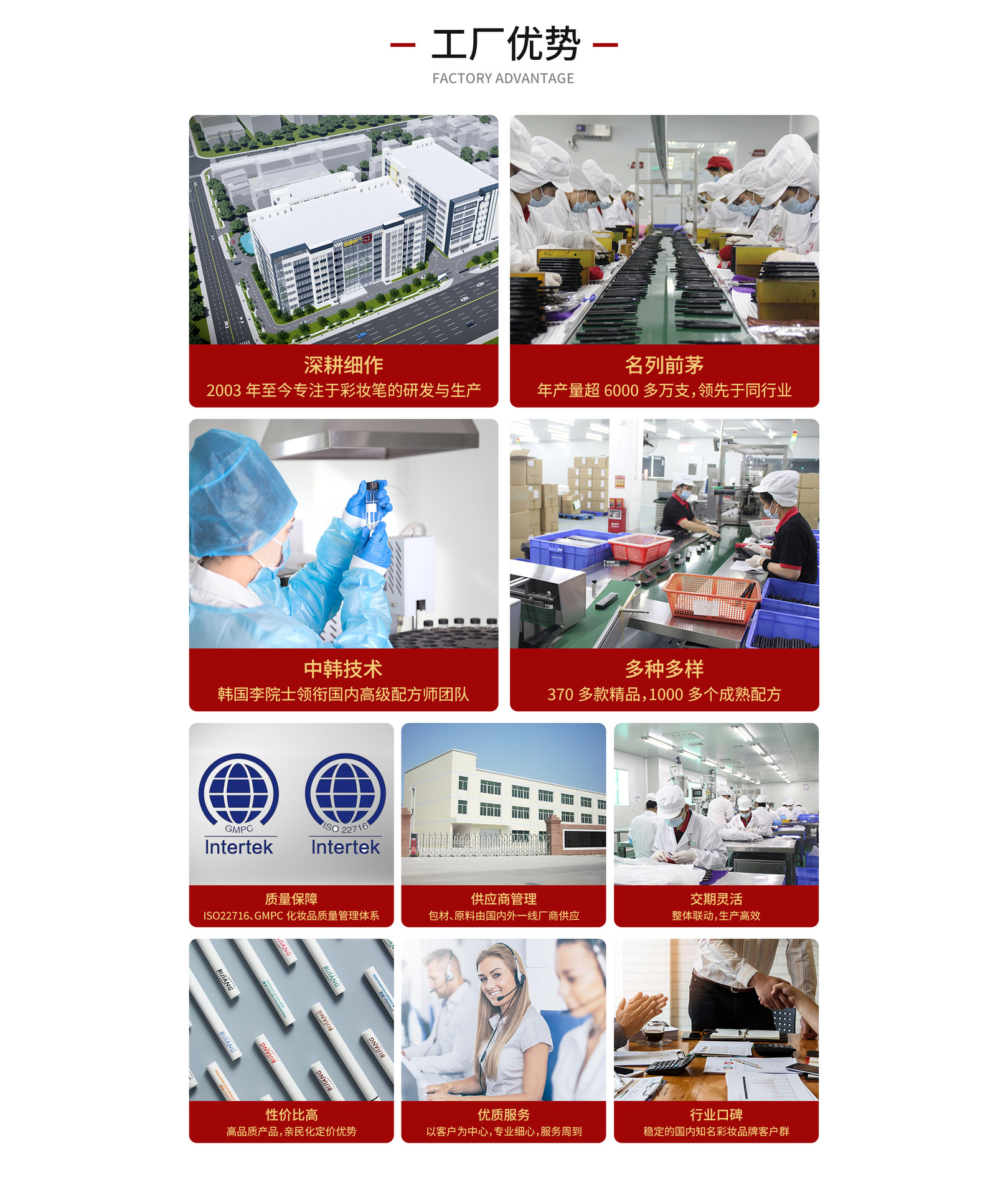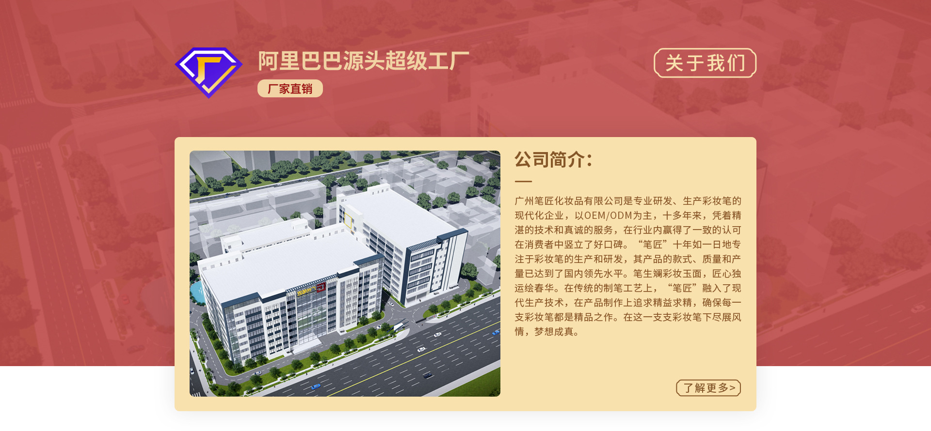 廣州筆匠化妝品有限公司以生產彩妝系列為主的獨資企業;現擁有八千多平方米現代化廠房,采用先進化的專業設備,先進的包裝生產線及半自動眉筆生產線、先進的口紅/睫毛膏灌裝機。擁有現代化的科研技術及研發團隊,配合精益化的開發和檢驗;集研究、開發、生產和銷售于一體,專業從事彩妝化妝品加工(OEM)及相關的代客服務(ODM)。產品包括眉筆、唇線筆、眼線液筆、眼影膏、遮瑕筆、修容筆、眼影、口紅、唇彩、睫毛膏。自2003年成立以來,堅持“獨具特色,創新卓越”的經營理念,嚴謹、踏實的工作作風,贏得了國內外眾多知名品牌的信賴,成為長期友好合作伙伴。 筆匠始終堅持以專注造就品質,用品質創造信譽。風雨激蕩十數載,匠師精勵鑄品牌,精華匯集于細微制作;筆匠之品,注重細節,精心打造,嚴謹細致、詮釋極致追求