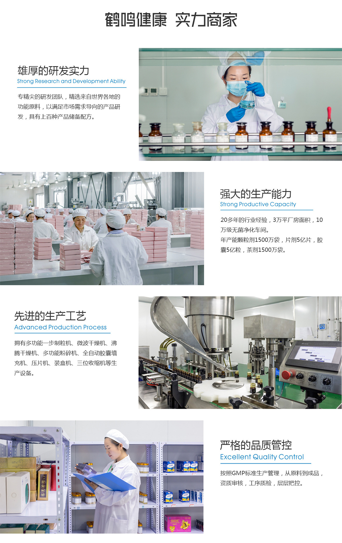 陜西鶴鳴健康科技有限公司成立于1996年,注冊資金2800萬元。現擁有100余畝的生產廠區,2萬余平米凈化車間,擁有軟膠囊、硬膠囊、片劑、粉劑、顆粒劑、口服液等保健食品現代化生產線,以及固體飲料、植物飲料、壓片糖果、凝膠糖果、濃縮果蔬汁、代用茶、方便食品、植物油等功能食品生產線。目前已通過ISO9001、HACCP認證、SGS認證、清真認證以及美國FDA注冊等在內的多項資格注冊和認證,產品獲歐美等多個國家市場準入資格。