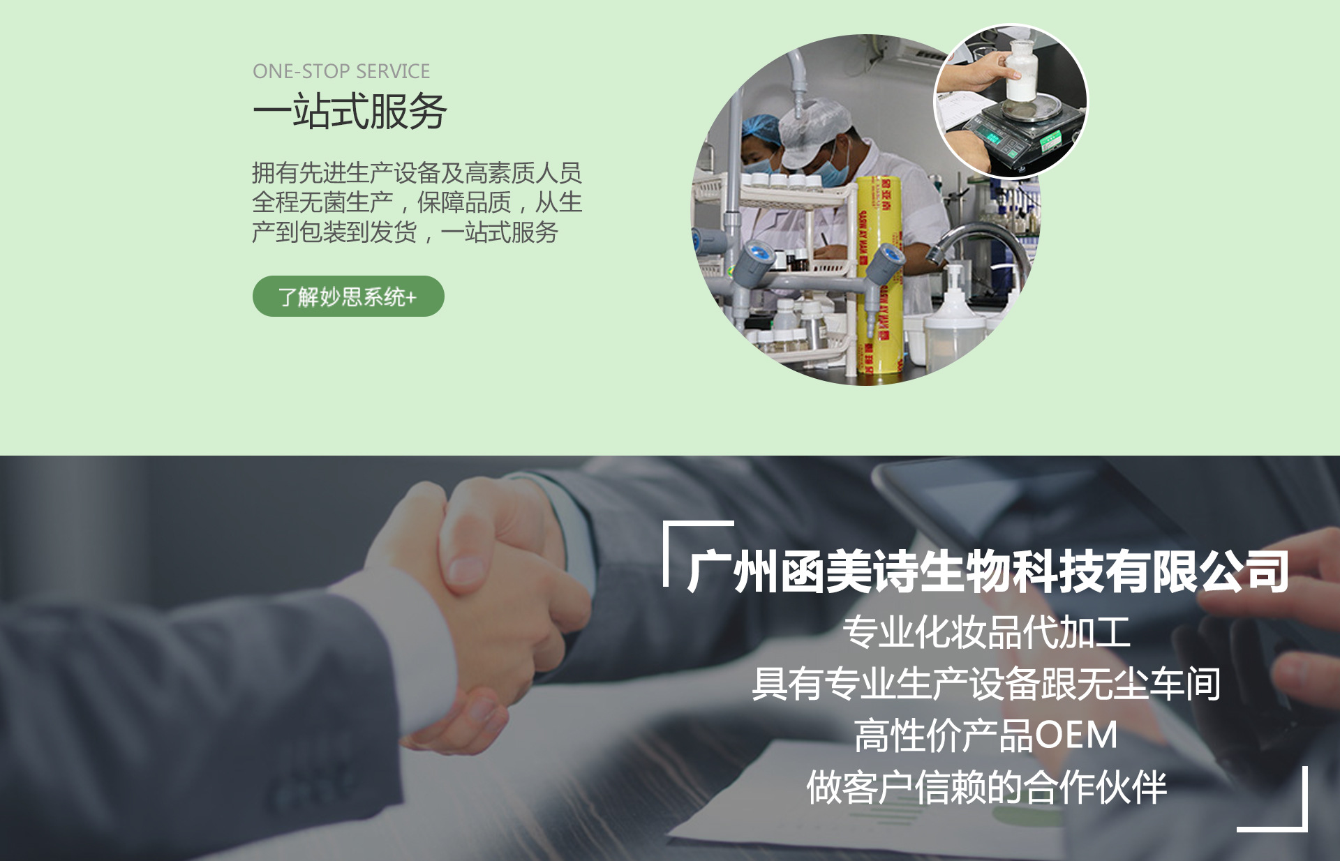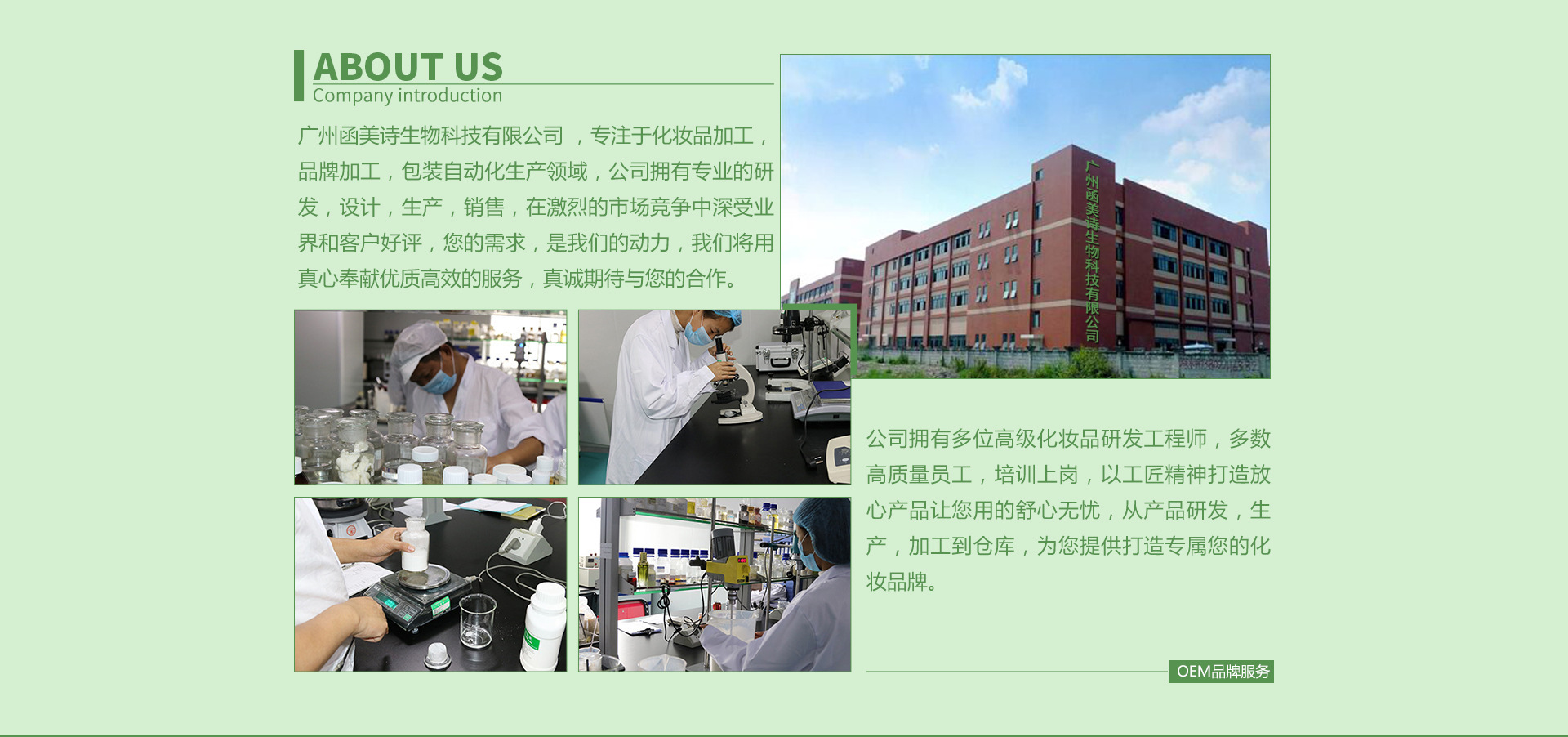 廣州函美詩生物科技有限公司是OEM、OEM代加工、甘油、精華液、精油、原液等產品專業生產加工的公司,擁有完整、科學的質量管理體系。廣州函美詩生物科技有限公司的誠信、實力和產品質量獲得業界的認可。歡迎各界朋友蒞臨參觀、指導和業務洽談。
