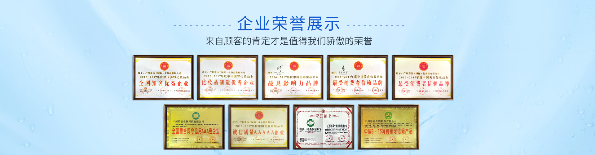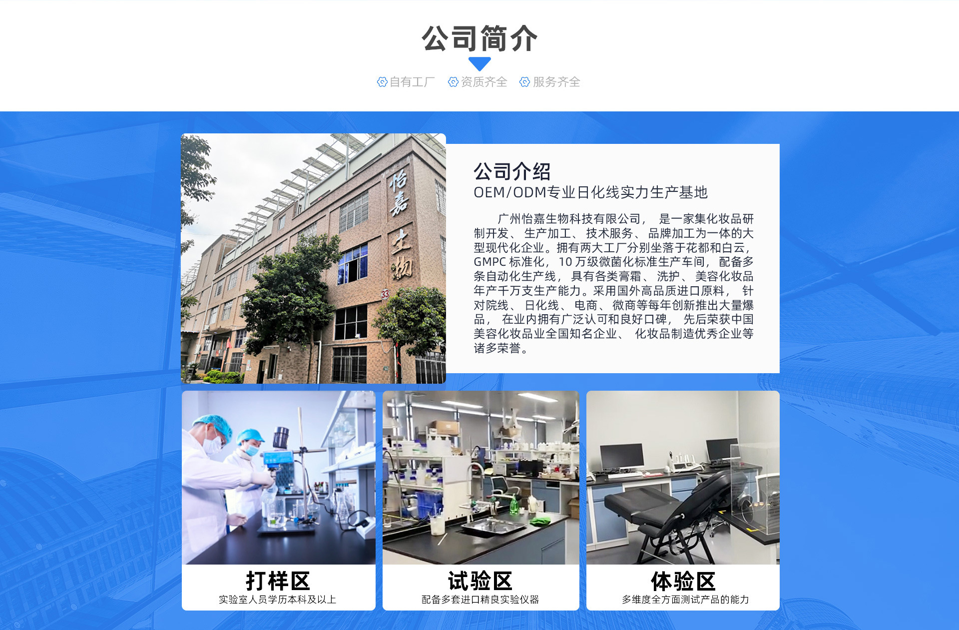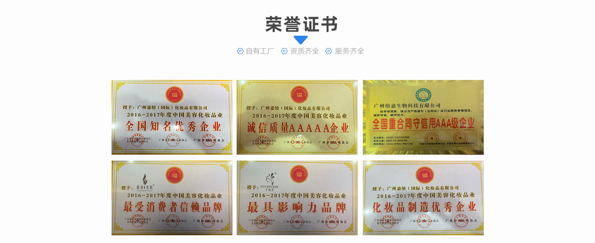 廣州怡嘉生物科技有限公司,是一家集化妝品研制開發、生產加工、技術服務、品牌加工為一體的大型現代化企業。擁有GMPC標準化,10萬級微菌化標準生產車間,配備多條自動化生產線,具有各類膏霜、洗護、美容化妝品年產千萬支生產能力。采用國外高品質進口原料,針對院線、日化線、電商、微商等每年創新推出大量爆品,在業內擁有廣泛認可和良好口碑,先后榮獲中國美容化妝品業全國知名企業、化妝品制造優秀企業等諸多榮譽。